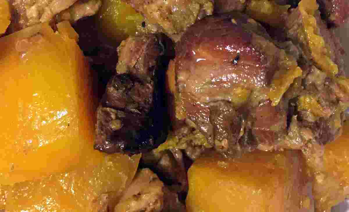 М'ясо промити, нарізати невеликими шматочками та обсмажити до рум'яної скоринки. Цибулю порізати кільцями і обсмажити окремо від м'яса. Промити й нарізати невеликими скибочками айву. Очистити гарбуз та нарізати на невеликі шматочки. Айву та гарбуз додати у сковороду, де смажилося м'ясо, туди ж влити воду, додати цукор, сіль, корицю і варити на повільному вогні протягом 2 годин.