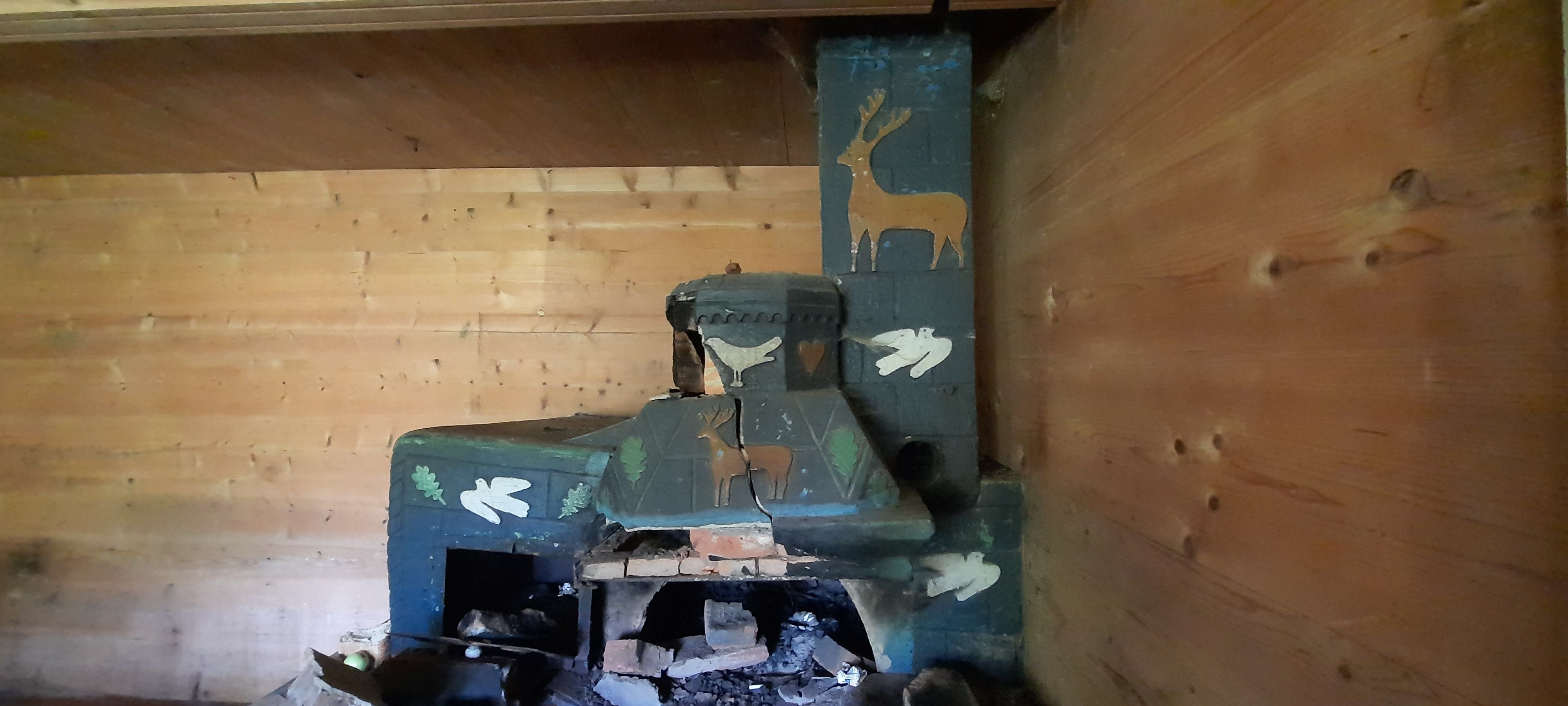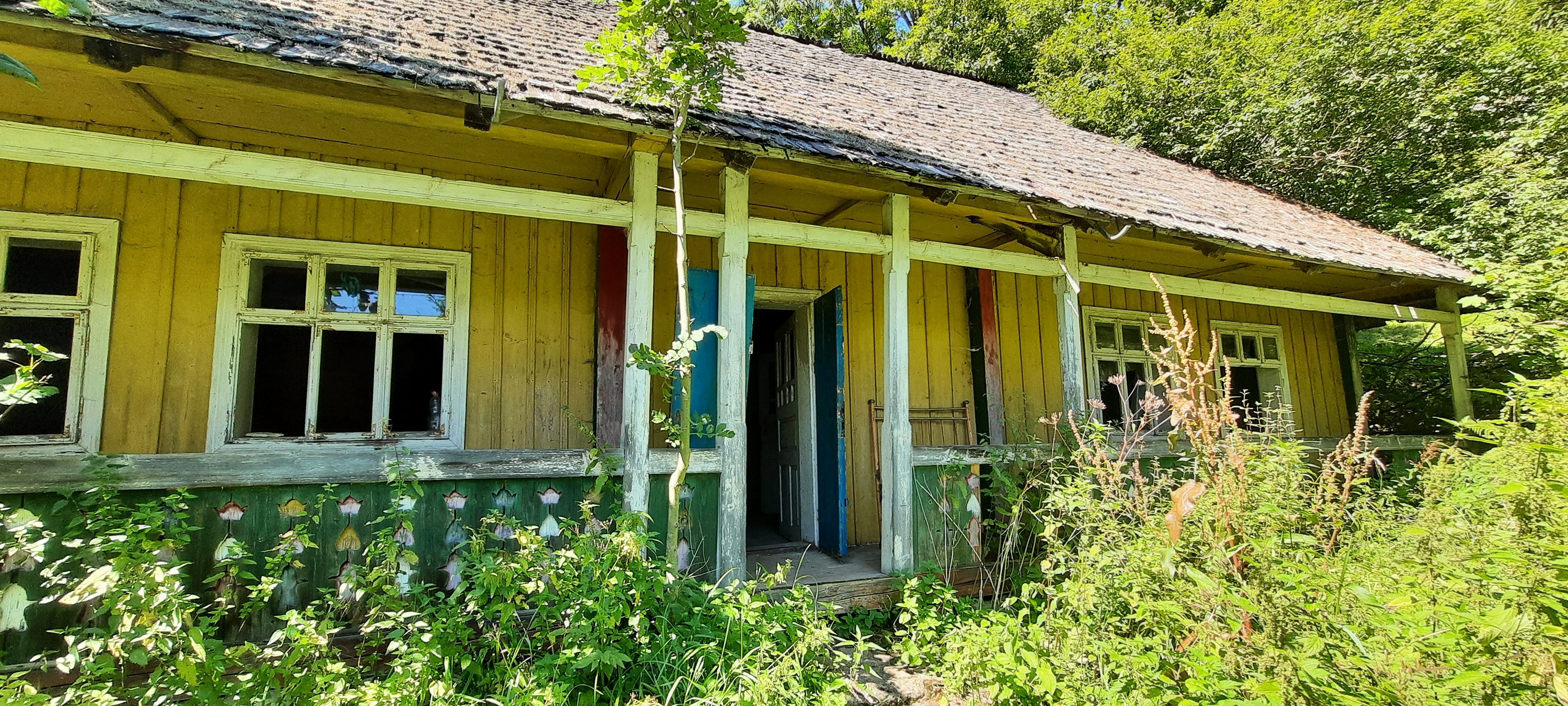 Поруч зі скелями доживає віку аварійна хатина, без вікон і дверей, але з ще збереженим різьбленим ґанком і розписами на стінах. Всередині – розвалений, але художньо оздоблений п’єц. Такий собі етнографічний зразок карпатської архітектури.