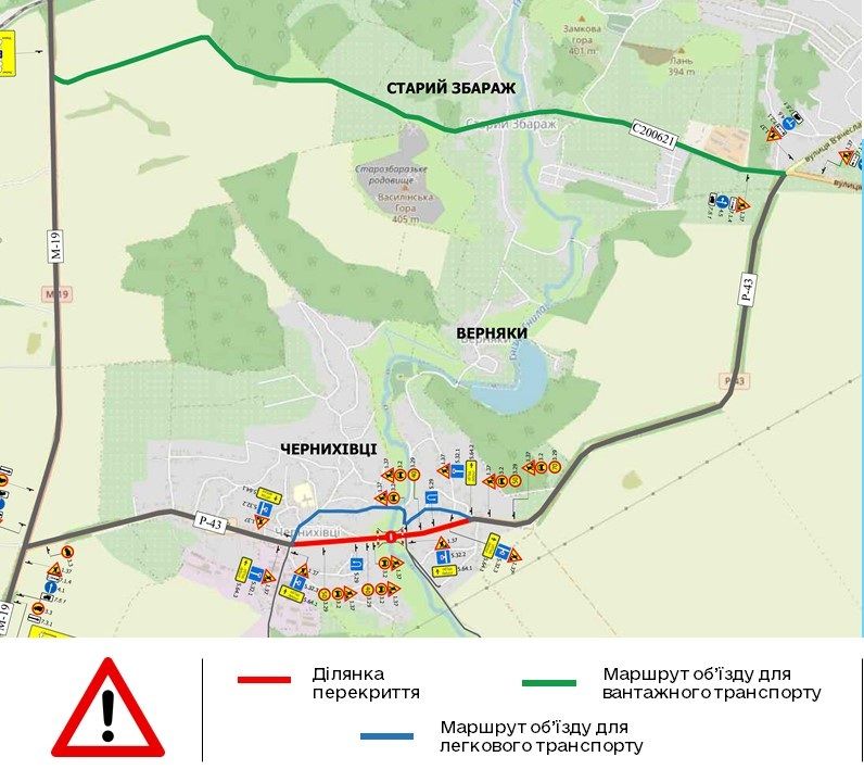 - Для легкових автомобілів об’їзд пролягає через комунальні дороги села Чернихівці;