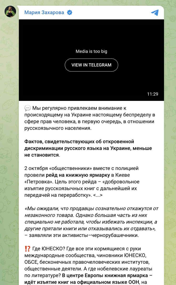 «Настав час визнати, що насильницька українізація та скасування рідної мови не спрацювали. Люди в Україні хочуть говорити рідною російською мовою, слухати нею пісні, їх же виконувати, здобувати освіту, читати книги, дивитися кіно», – написала Марія Захарова.