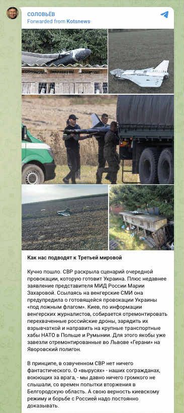 Кремлівський воєнкор і пропагандист Алєксандр Коц заявив, буцімто Україна планує «провокації проти європейських країн». У своєму матеріалі він посилається на представницю російського МЗС Захарову та Службу зовнішньої розвідки РФ. Ці «експерти» нещодавно стверджували, що Україна буцімто збирається відремонтувати перехоплені російські дрони, зарядити їх вибухівкою та направити на великі транспортні хаби у Польщі та Румунії. Для цього нібито вже завезли відремонтовані у Львові «герані» на Яворівський полігон.