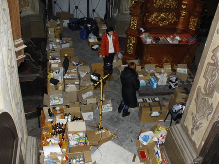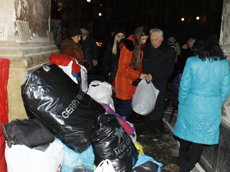 Хтось приносить харчі, хтось теплі шалики, інші здають гроші, щоб підтримати тих, хто в Києві. Речі для Майдану збирають у кількох місцях. Серед них – гарнізонний храм св. ап. Петра і Павла, колишній костел єзуїтів.