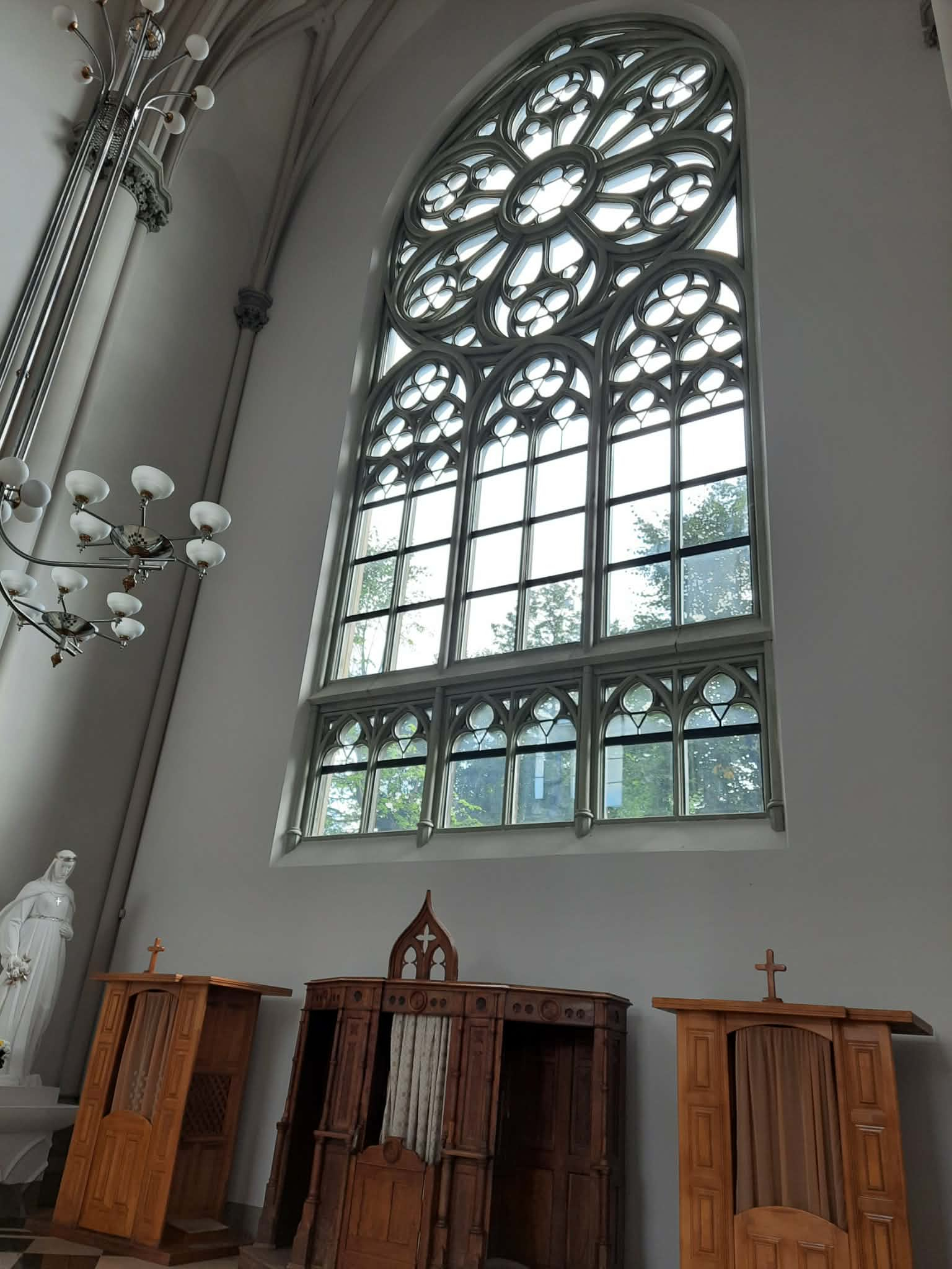Перші вітражі 1930-х років знищили у радянський час. Сучасні – в апсидній частині храму у 1990-х виконав художник Валерій Шаленко. У 2014 році Олександр Личко створив для церкви перший в Україні вітражний іконостас. Як розповів адміністратор храму о. Іван Галімурка, світильники зробили на бронетанковому заводі. Їхні форми перегукуються з колонами в інтер’єрі. У церкві можна піднятися на шпиль, який є гарною оглядовою вежею з панорамою міста.