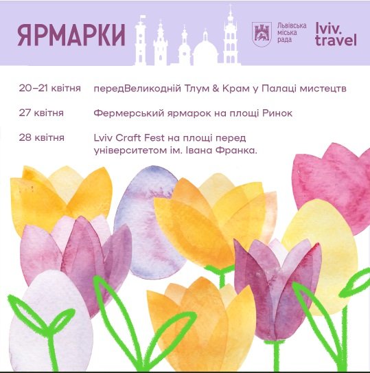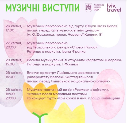 У ці вихідні у Львові також заплановано чимало подій за програмою «Львів – місто весни»: у суботу фермерський ярмарок на Ринку і Lviv Craft Fest в неділю на площі перед університетом, музичні перформанси і поетичні вечори, майстер-класи з малювання квіткових картин і оздоблення вербової гілки. Більше детально – за посиланням.