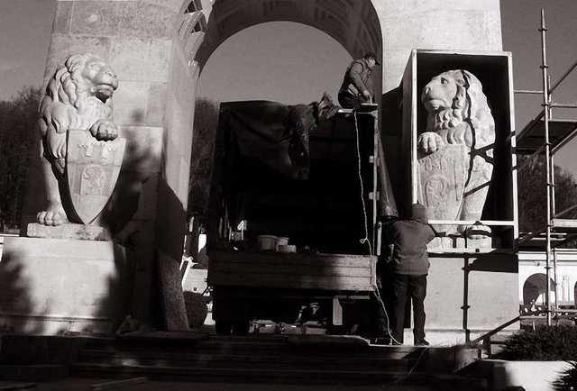 Кам'яних левів з-під тріумфальної арки зняли 1967 року. Відтоді й почалася їхня одіссея. У радянської влади Львова не було якогось більш-менш чіткого плану, що ж з тими левами робити. Розбити їх на друзки не наважилися навіть комуністи. Тому було вирішено використати символи міста для утвердження в ньому нового львівського радянського міфу.
