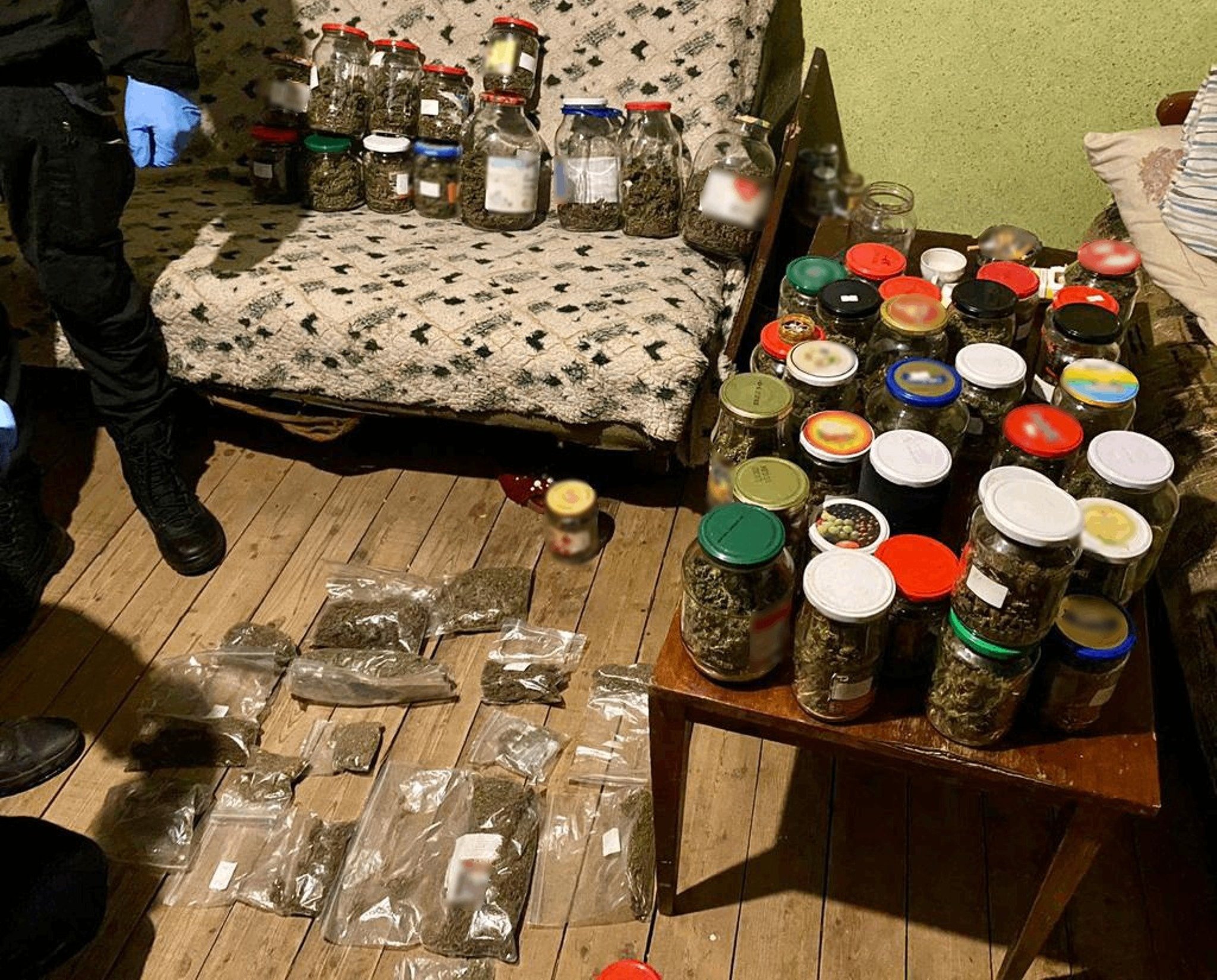 «У помешканні підозрюваного поліцейські провели обшук та виявили партію готової марихуани, яку фігурант розфасував у 15 поліетиленових пакунків та 51 скляну банку. Загалом вага вилученого складає орієнтовно пів кілограма», – йдеться у повідомленні.