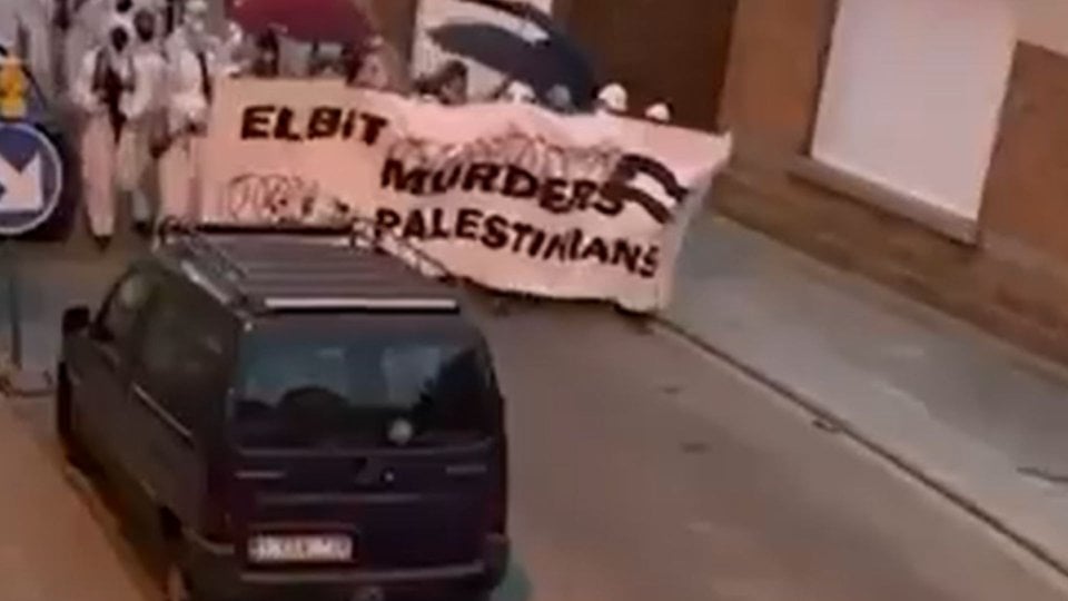 На відео, оприлюднених у соцмережах, видно, як натовп в білому одязі вибігає з території компанії, а згодом крокує вулицями з плакатом «Elbit вбиває палестинців». Зазначимо, Elbit Systems – ізраїльська компанія, дочірнім підприємством якої є OIP Sensor Systems, в яку, своєю чергою, входить OIP Land Systems.