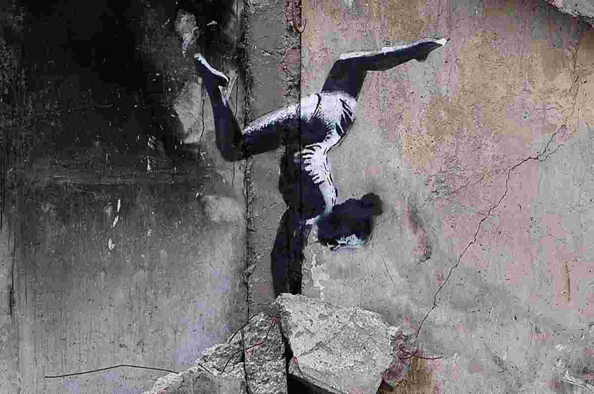 Художник намалював графіті на стіні одного з майже повністю зруйнованих російськими військами багатоповерхових житлових будинків. На графіті зображена гімнастка, що виконує одну з вправ на уламках будівлі, що впираються і непошкоджену стіну.