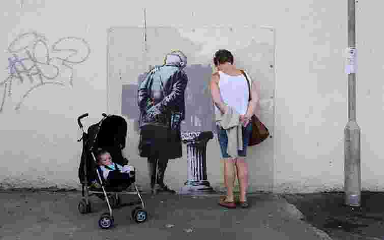 На графіті Бенксі зображена літня дама з сивими кучериками, яка роздивляється мармуровий постамент із чимось не зрозумілим. Власне це зображення було на стіні до появи роботи Бенксі.