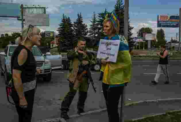 У Донецьку терористи прив’язали до стовпа обмотану українським прапором жінку, яку вони звинувачують у шпигунстві. Жінку змусили тримати в руках табличку з написом «Она убивает наших детей. Агент карателей».