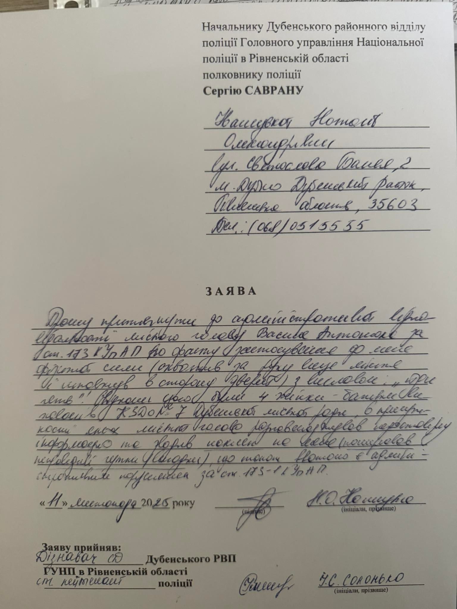 У Дубні між начальницею управління освіти Наталією Іваницькою та міським головою Василем Антонюком виник конфлікт через відсутність опалення у дитсадку №7. Посадовиця стверджує, що під час суперечки мер штовхнув її, тож вона звернулася із заявою до поліції. Водночас Василь Антонюк заявив, що такого інциденту не було й назвав усе вигадкою.