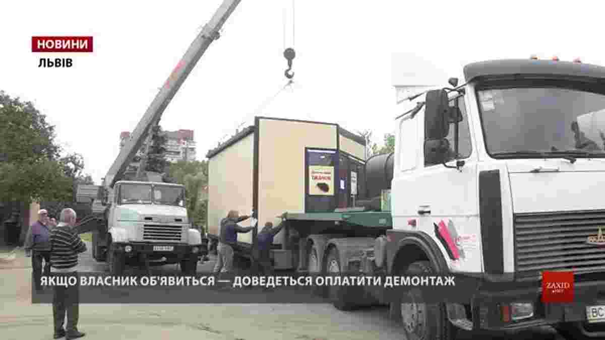 Незаконно встановлене дитяче кафе везуть до шляхо-ремонтного підприємства. Тут воно зберігатиметься рік. Якщо власник не знайдеться, можуть і продати.