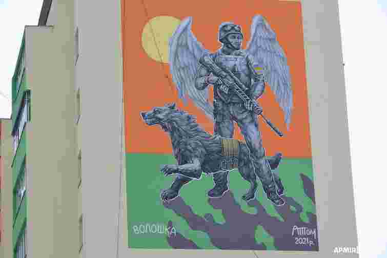 На муралі зобразили військовослужбовця зі снайперською гвинтівкою та вовкулаку. «Вовкулака є символом Сил спеціальних операцій Збройних Сил України, а військовослужбовець, який зображений на муралі, має риси обличчя 33-річного снайпера окремого полку Сил спеціальних операцій імені князя Ізяслава Мстиславича старшого солдата Уберта Мрачковського», – повідомило спеціалізоване видання «Армія інформ».
