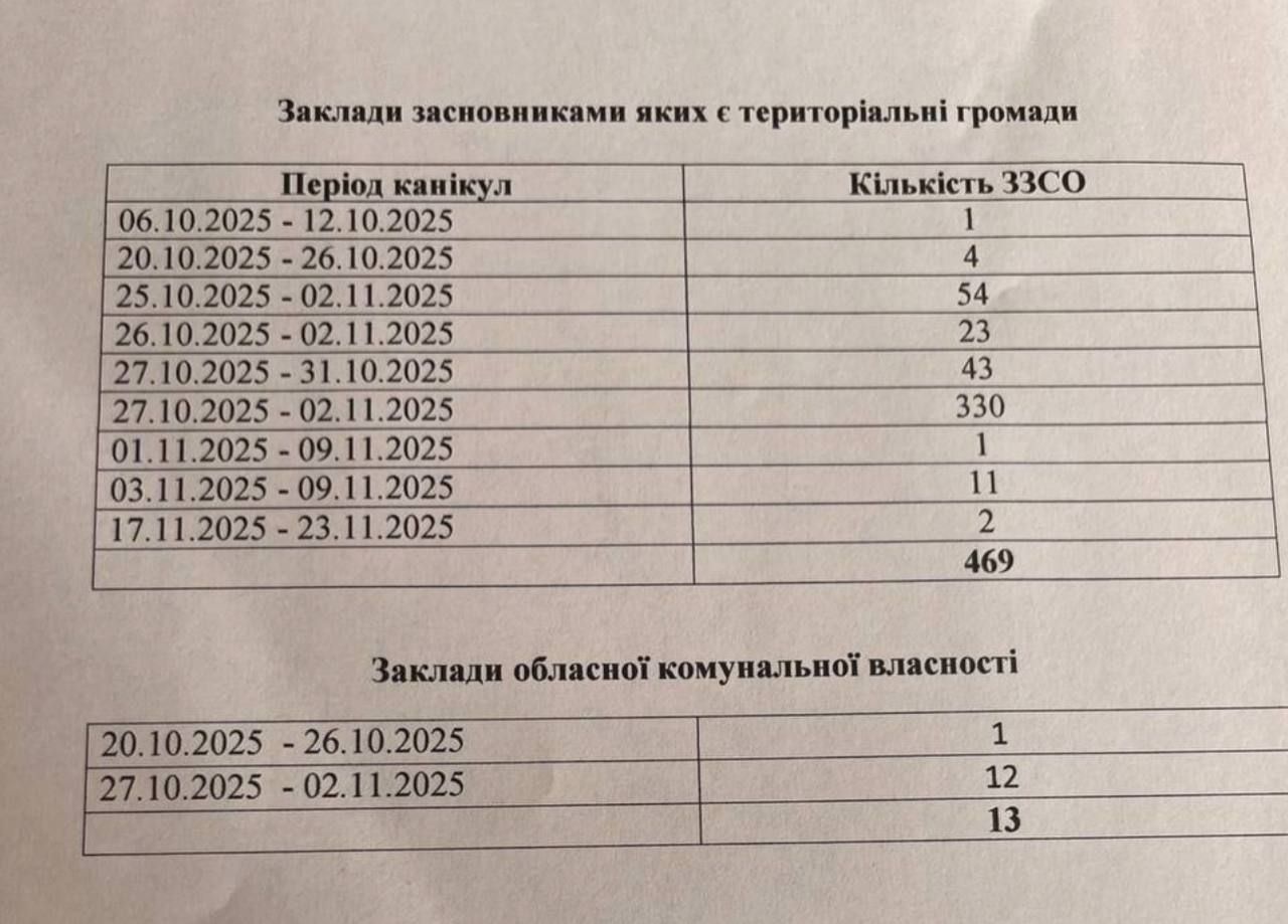 Першими цьогоріч на осінні канікули пішли учні ліцею «Гармонія» та навчально-виховного комплексу «Мої обрії». Через ріст захворюваності дітей відправили на відпочинок з 6 до 12 жовтня. Водночас, згідно з даними департаменту освіти та науки Хмельницької ОДА, у деяких навчальних закладах області осінні канікули розпочнуться лише 17 листопада.