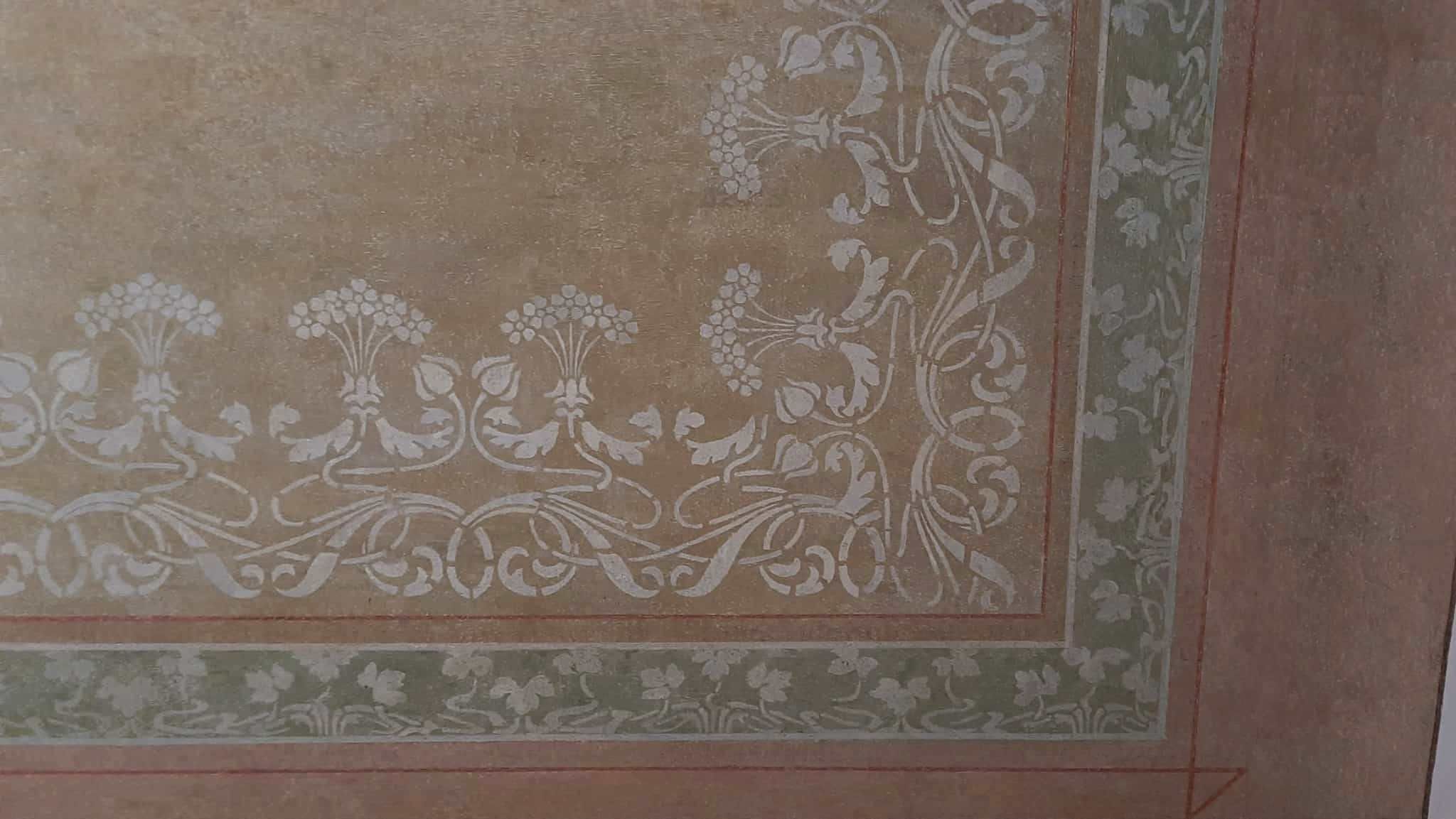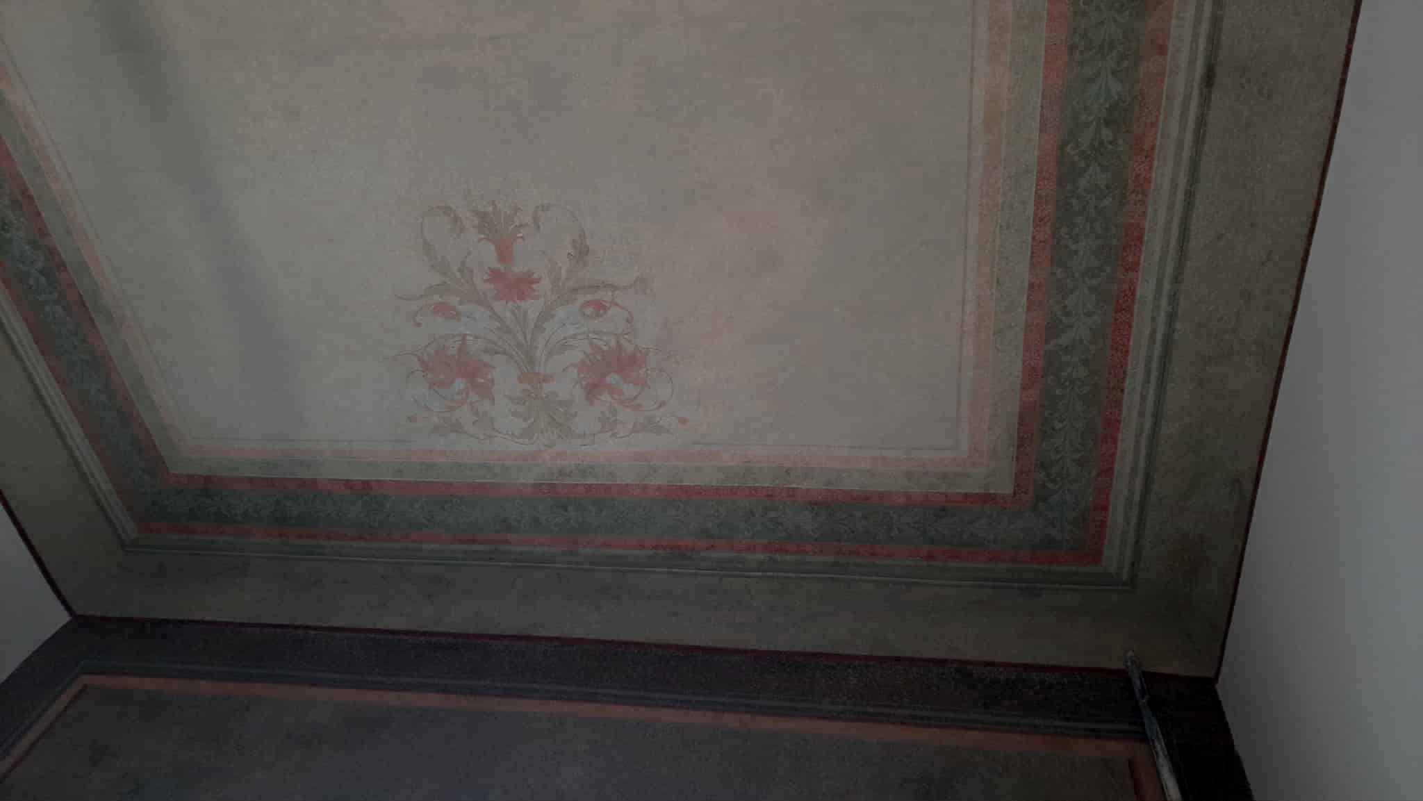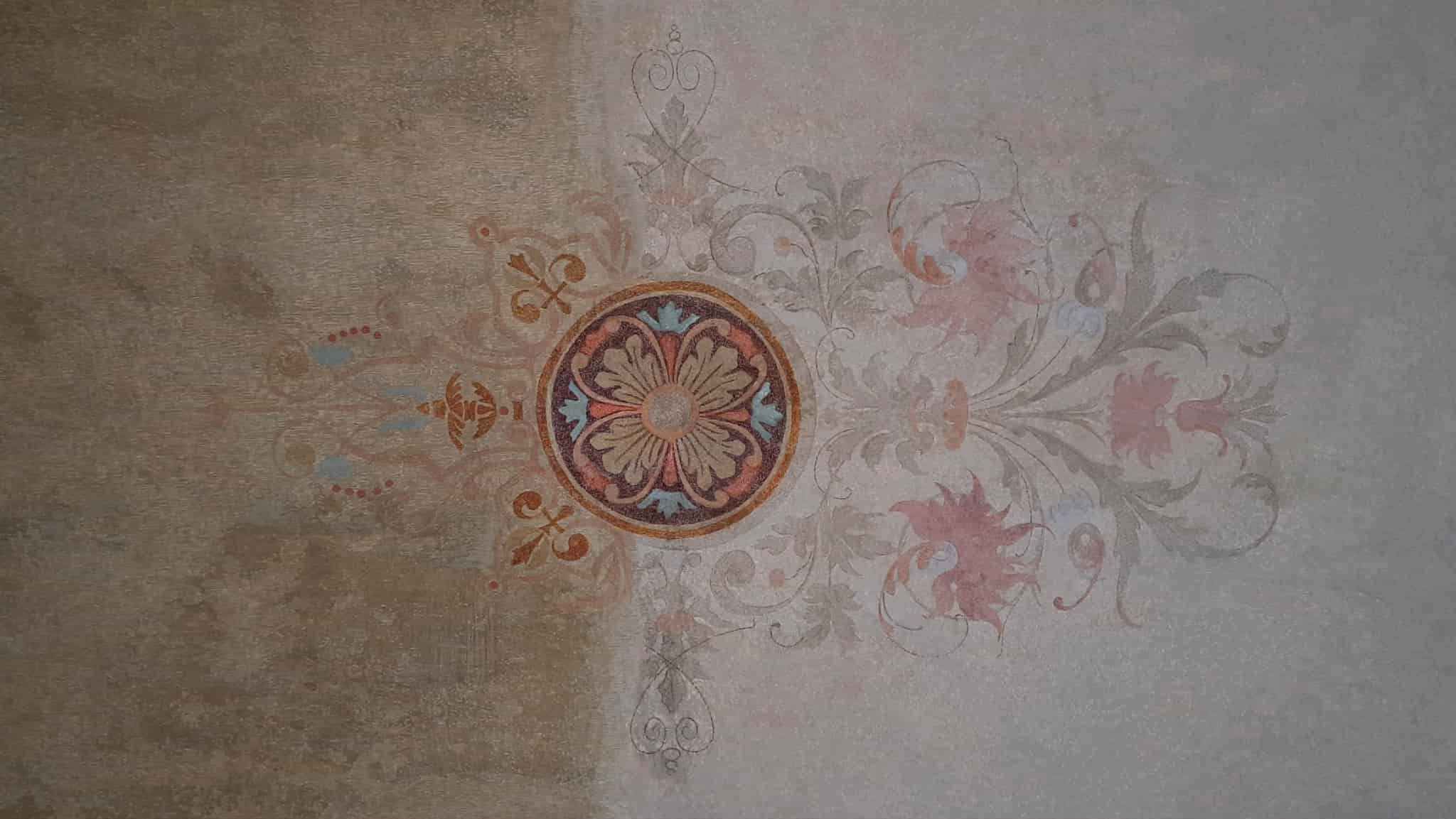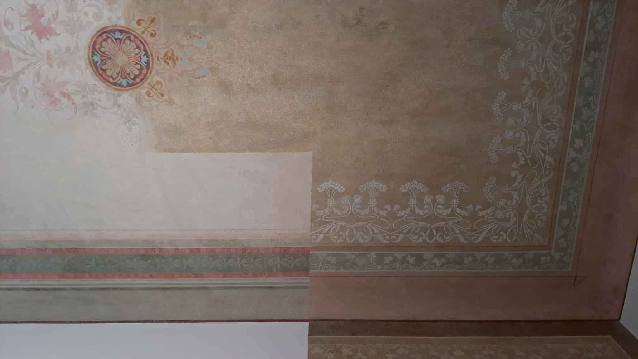 «Там було два шари сітки під штукатуркою. Але під ними все-таки збереглися розписи стелі. Розетка посередині була дуже знищена. Квіти збереглися на відсотків 30%, їх копіювали з тих частин, де вони вціліли. Один фрагмент був зовсім втрачений. Але я знайшла в історичному каталозі віденських майстрів кінця XIX ст. цю схему і реконструювала за цим зразком», – розповідає Ірина Гірна, яка впродовж дев’яти місяців відновлювала лише фрагмент в одному куті кімнати.