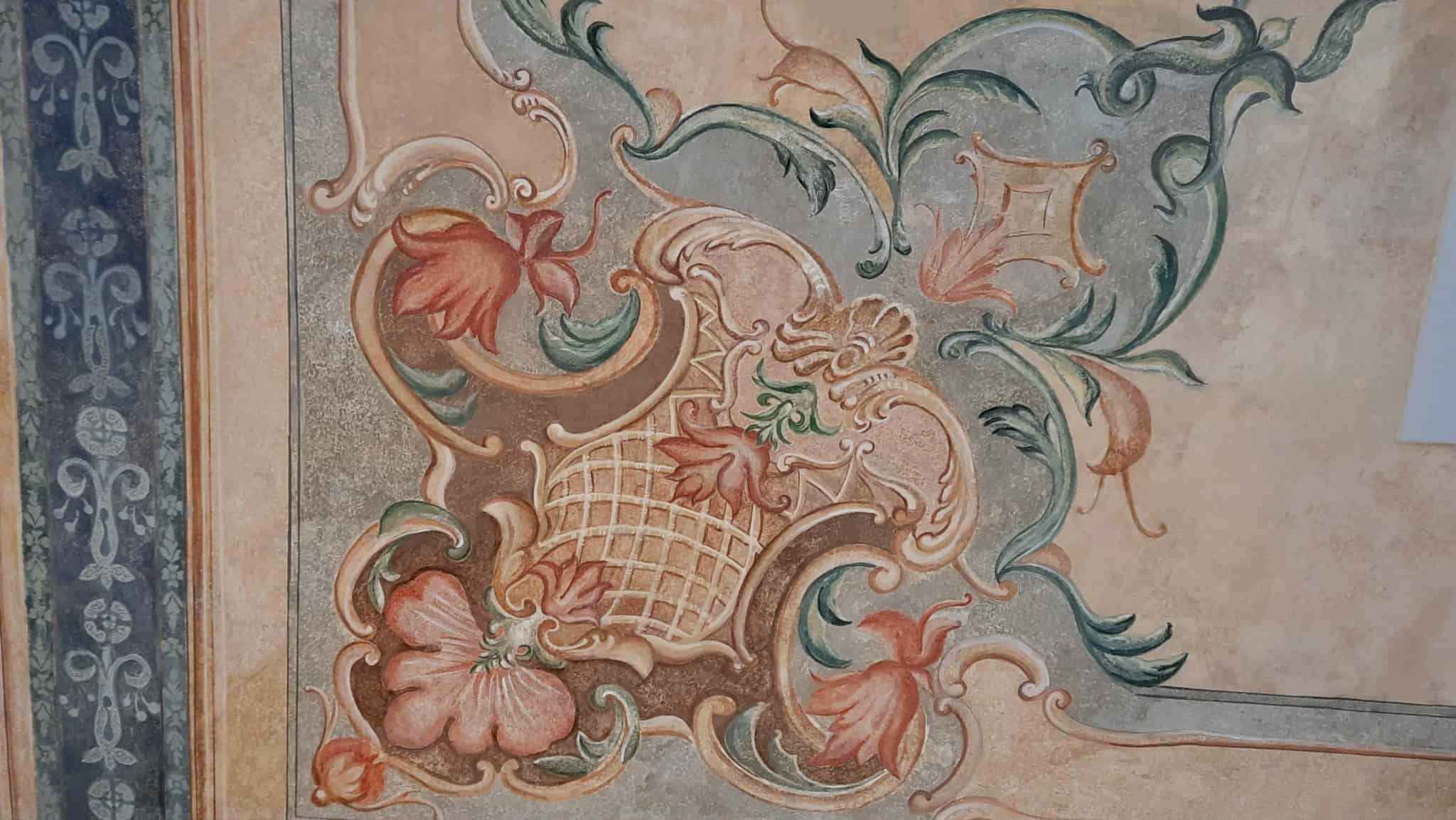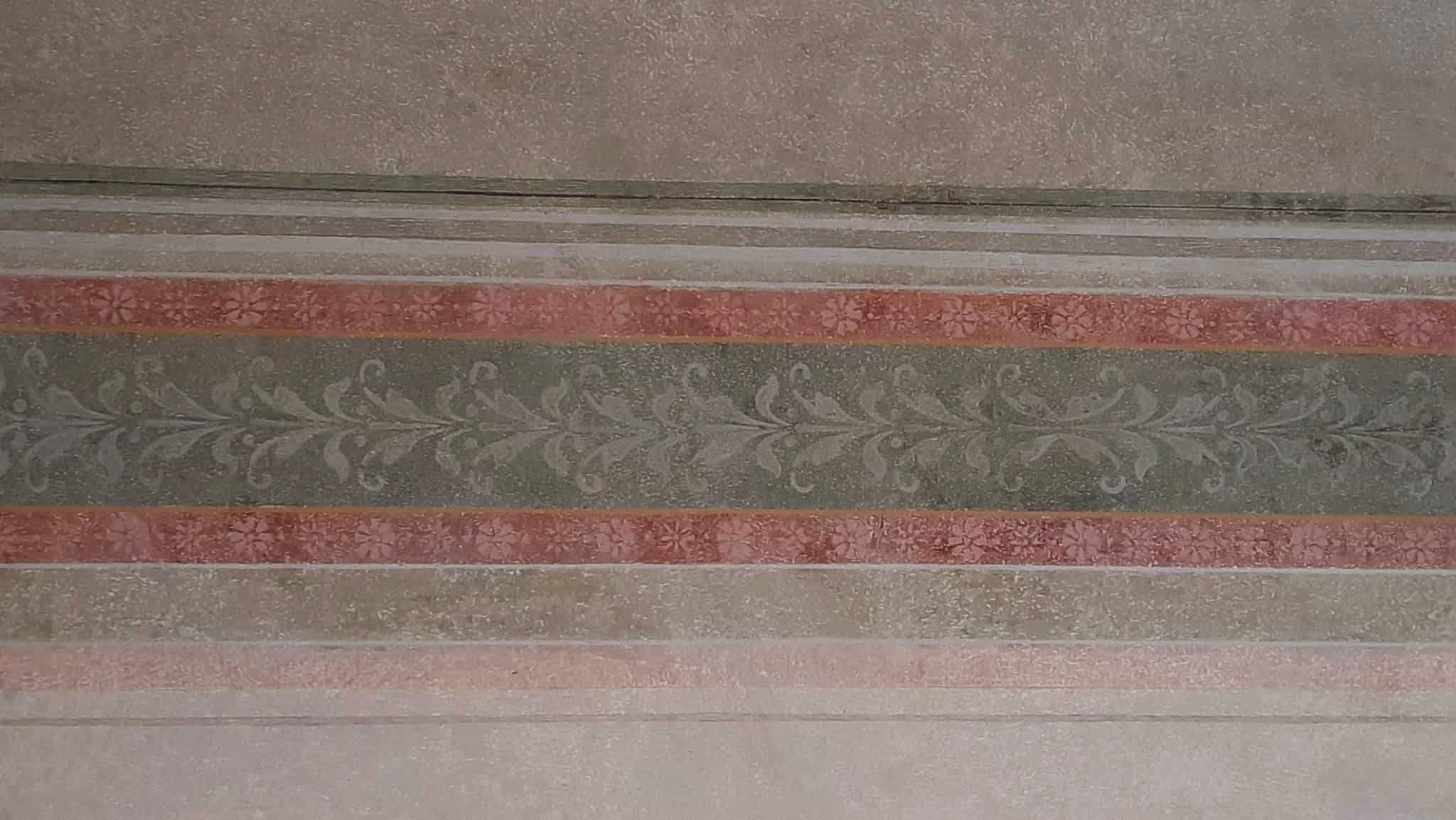 Найдавніші розписи – з часу побудови кам’яниці, характерні для кінця XIX ст. Це зелений з червоним обрамленням фриз на стелі, посередині розета, оздоблена квітами. Вони були у доброму стані збереження, проте вже приблизно за десять років на стелі нанесли нову розету з оздобами.