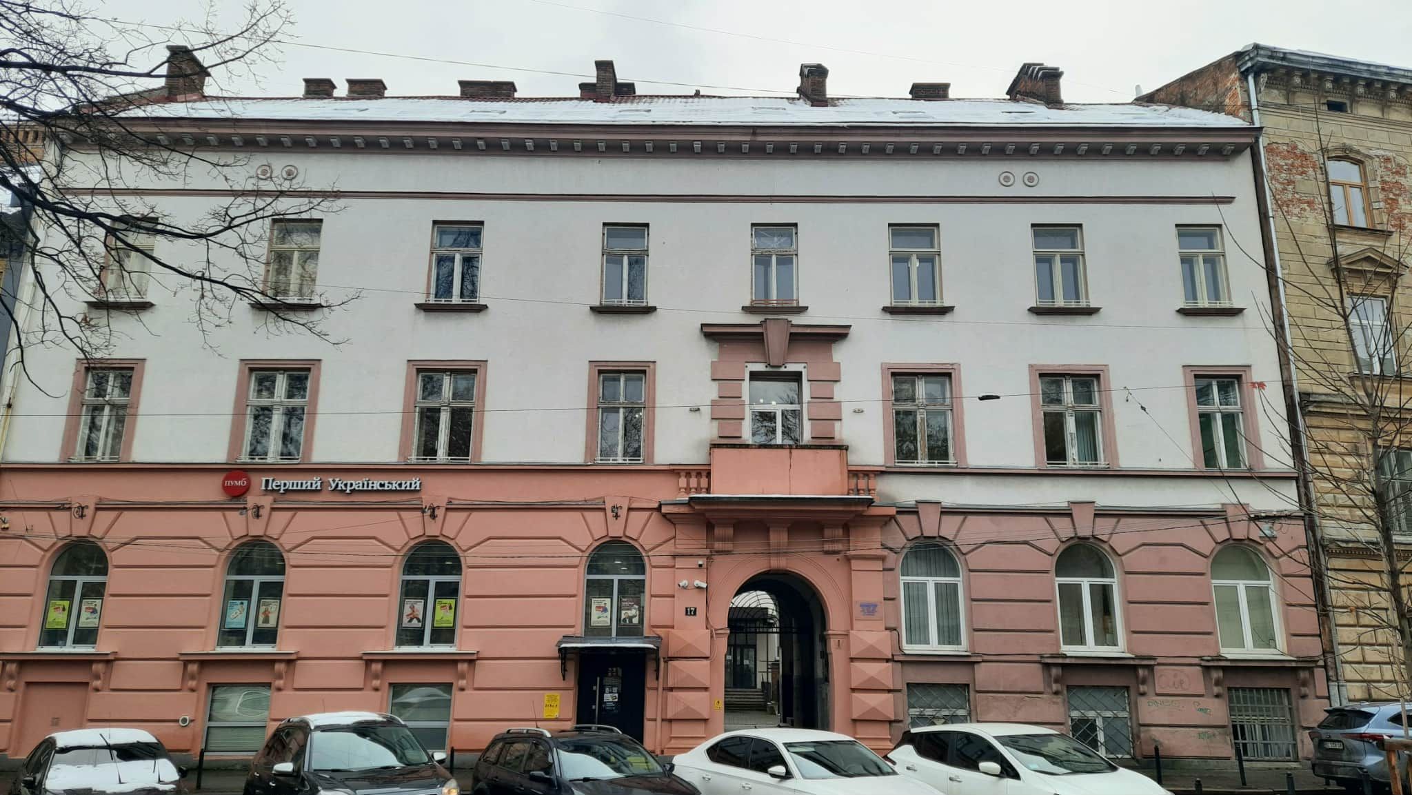 Будинок №17 на сучасній вулиці Мирослава Скорика у центрі Львова спорудили 1897 року за проектом Діонісія Кшичковського. Тоді він мав багато оздоблений необароковий вигляд. Нині ж простенький фасад у дивному рожевому кольорі не виказує якихось особливих цінностей. Тим паче, що від самого початку він не був житловим, там працювали різні офісні приміщення. Втім, триповерховий будинок мав також вишуканий інтер’єр, зокрема розписи стін. Праве крило є давніше, а ліве добудували на кілька років пізніше. Від розкішного колись фасаду зараз мало що залишилося: ліпнину і аттик було втрачено в період міжвоєння. В коридорах – радянські панелі і олійні фарби.