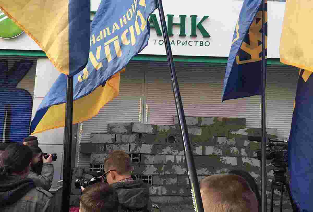 Представники партії «Національний корпус», лідером якої є нардеп Андрій Білецький, замурували цеглою вхід до центрального офісу «Сбербанку» на Володимирській вулиці в Києві. Фотографії акції активісти виклали на своїй сторінці у Facebook.