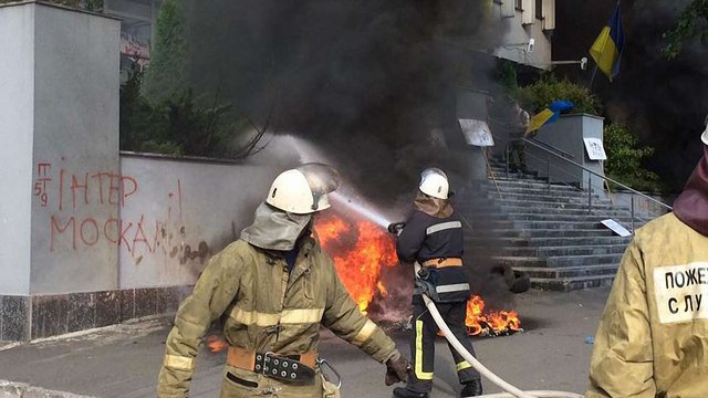 За словами очевидців, до будівлі під'їхали пожежні машини і поліція. «У будинку знаходяться люди. На паркані написали "Інтер агенти Кремля"», - уточнили у виданні.
