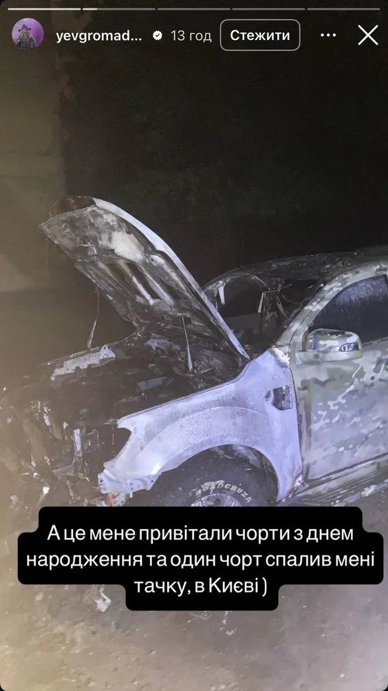 Власником спаленого автомобіля виявився офіцер Нацгвардії Євгеній Громадський, який отримав звання Героя України у березні 2022 року. 17 червня на своїй сторінці в інстаграмі він повідомив про підпал