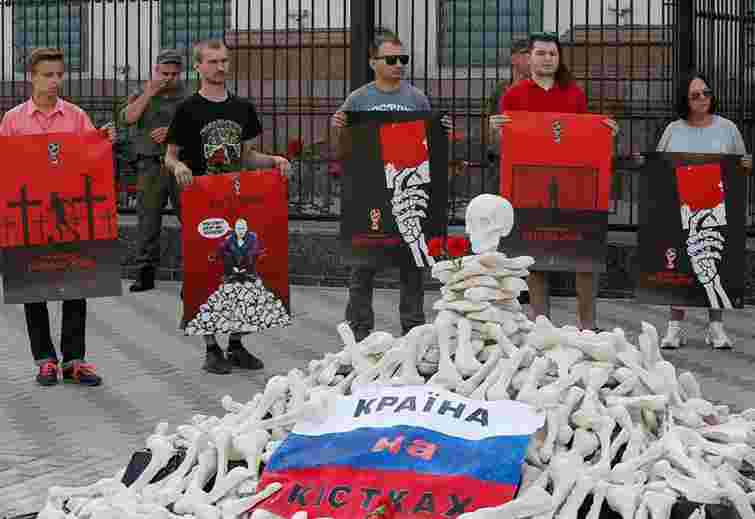 У Києві біля посольства Російської Федерації активісти влаштували акцію із закликом бойкотувати чемпіонат світу з футболу, який проходить в РФ. Про це повідомляє ТСН.