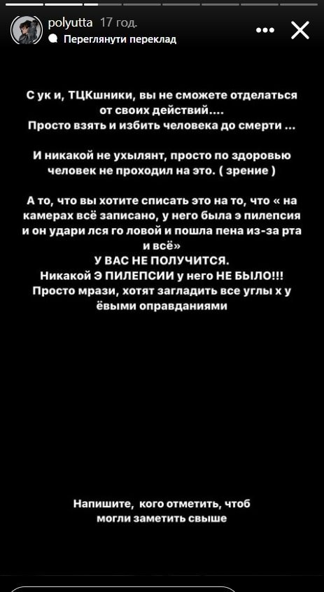 Водночас дочка померлого чоловіка Поліна Зайцева на своїй сторінці в Instagram заявила, що в батька не було епілепсії, а помер чоловік нібито через побиття з боку співробітників ТЦК. За словами дівчини, її батька забрали до ТЦК, де його двічі навідувала його мати – начебто для того, щоб передати гроші на військове спорядження.