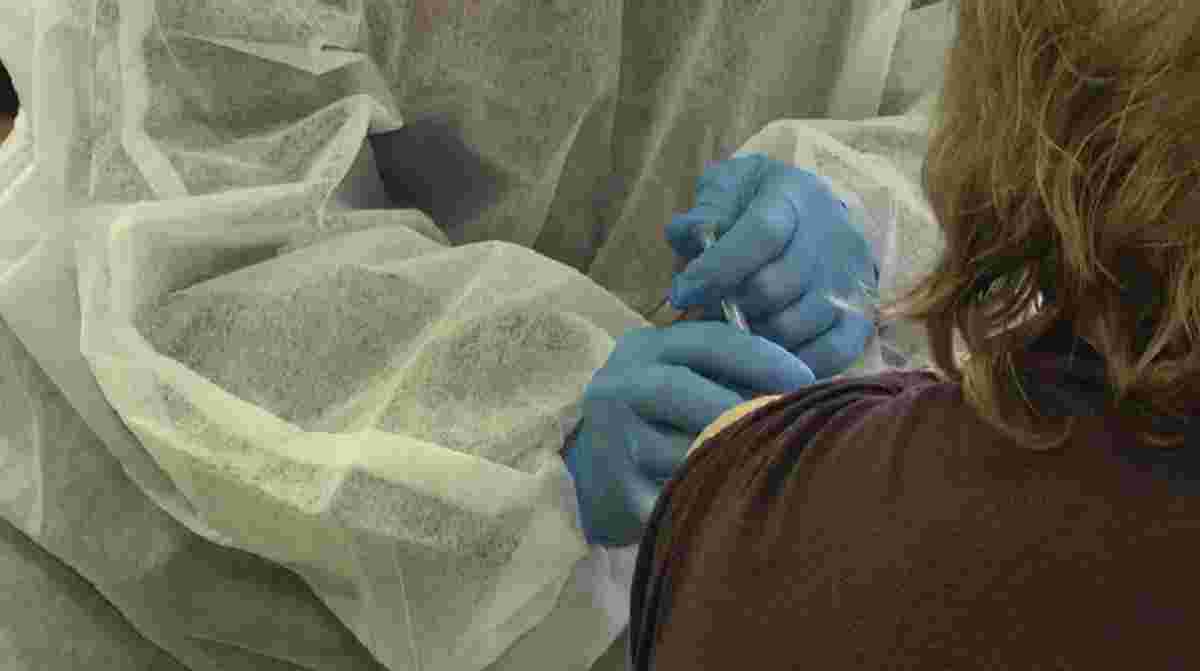 До гімназії зійшлися педагоги з кількох ближніх шкіл. Спочатку вони заповнюють згоду про вакцинацію, відтак щепляться. На вибір є дві мРНК-вакцини: Pfizer та Moderna. Ними сьогодні планують імунізуватись понад 80 людей.