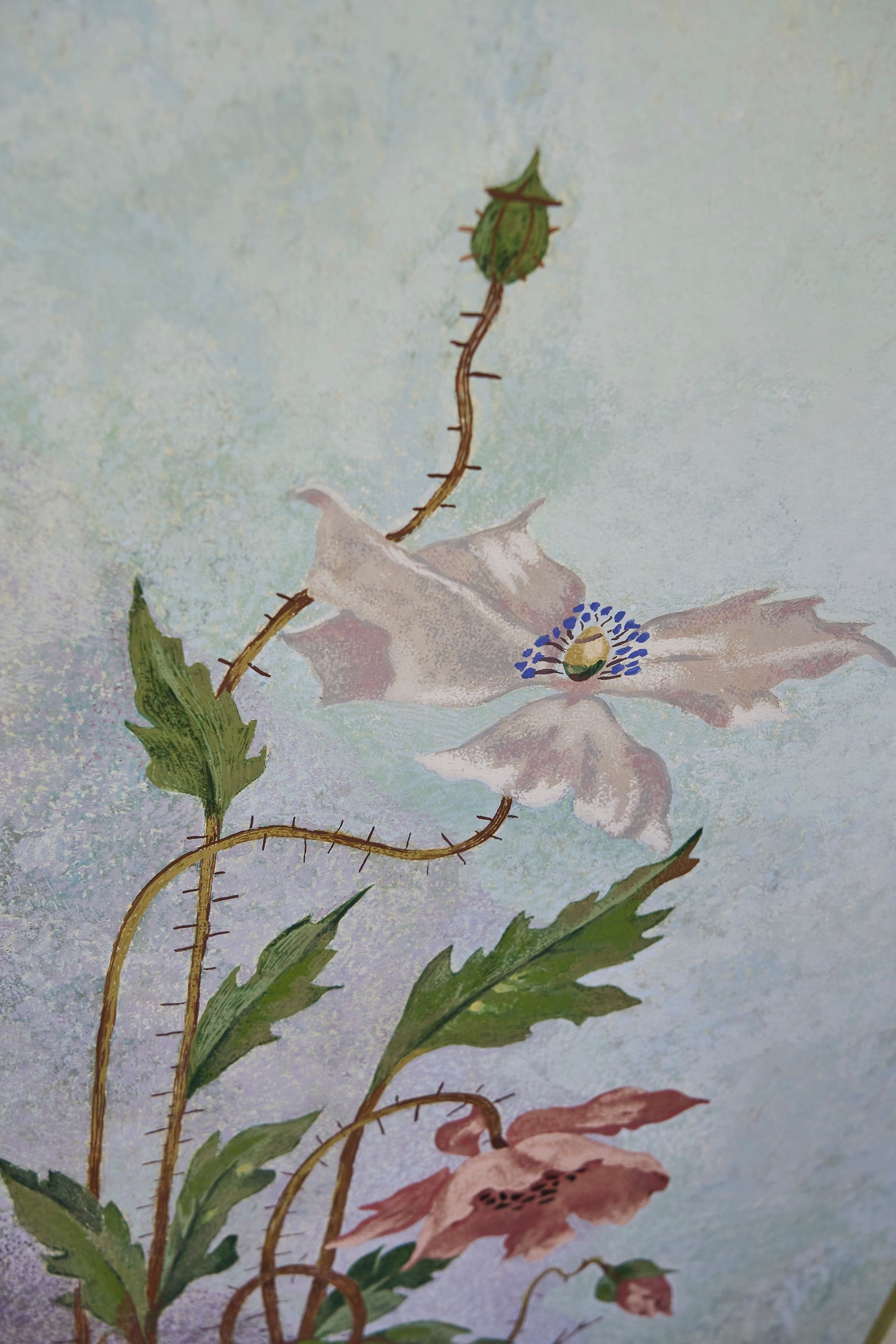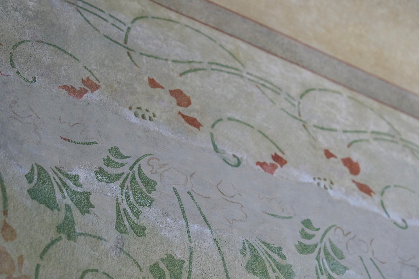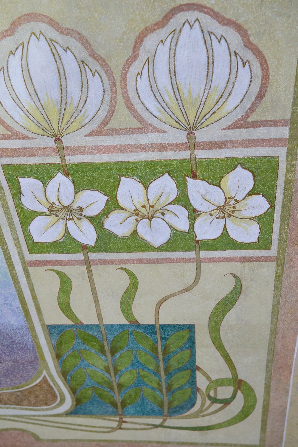«Тематика розписів спільна – квіткова. На всіх поверхах йде однаковий фриз і великі маки на стінах. Це багаті сецесійні розписи, не просто декор, а квіти, небо, метелики на стелі мальовані від руки. На стінах є трафаретні розписи, але дуже якісні, багатошарові. Виявили також розписи міжвоєнного періоду», – каже Ірина Гірна.
