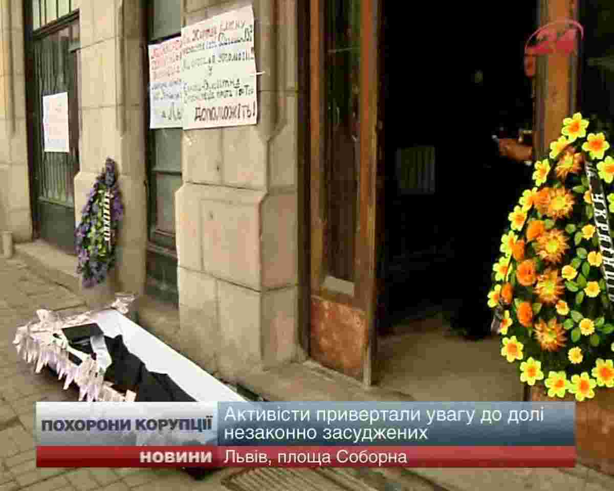 Учасники акції принесли вінки від усіх українців, а до труни, обклеєної грішми, поклали суддівську мантію. У такий спосіб вони намагалися, до того ж, привернути увагу до долі незаконно засуджених, які не один рік сидять за ґратами.