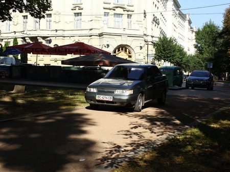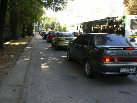 У центрі Львова вулицю Листопадового чину, що прилягає до парку ім. Івана Франка, попри заборонні знаки, кожного дня повністю запарковують автомобілями з обох сторін. Автомобілі заїжджають навіть на пішохідні доріжки парку. Водночас в управлінні Львівської залізниці, що розташоване поруч, ZAXID.NET запевнили, що у них є гараж і автомобілі управління там не паркують.