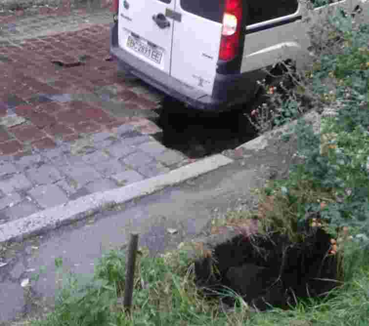 У Львові через прорив водопроводу провалився тротуар і бруківка під бусом