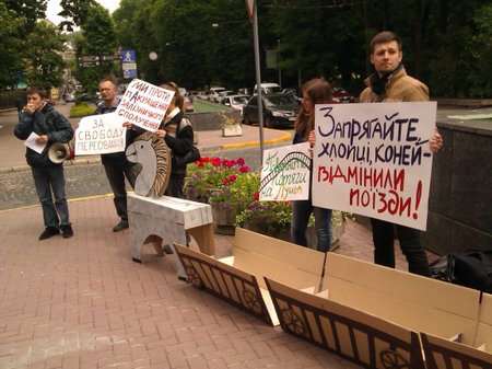 У межах акції ГР «Відсіч» проілюструвала підхід залізниці «Запрягайте, хлопці, коней – відмінили поїзди» за допомогою картонного коня з вагонами.
