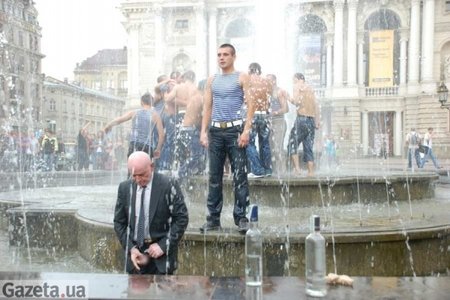 Через деякий час святкування перемістилися до фонтану перед львівською оперою. Почали стрибати у нього.