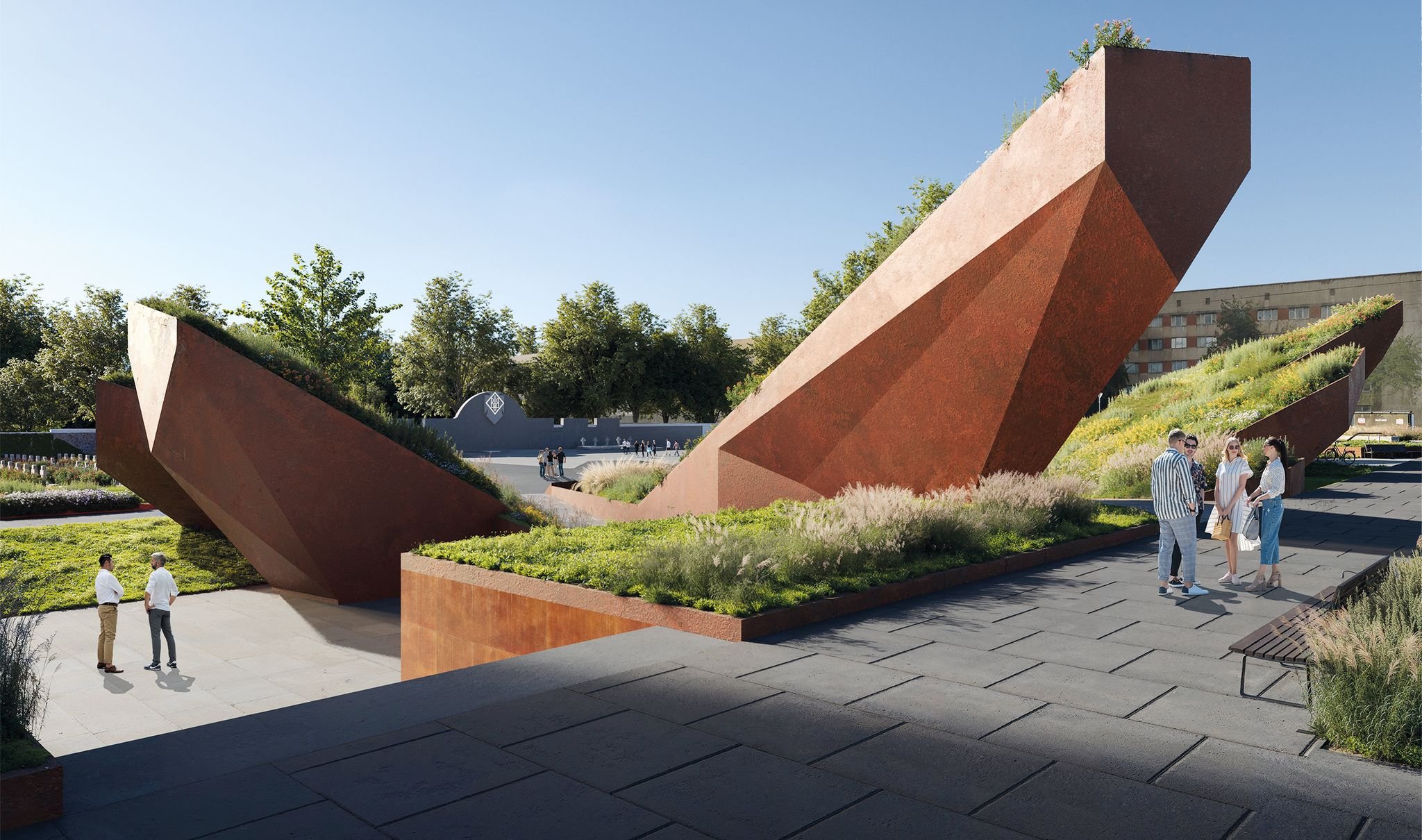«На передній частині комплексу біля вулиці Мечникова пропонуємо облаштувати площу із монументом невідомому воїну. Концепція нової площі полягає у зміненні осі міста на вісь історичну. Ця вісь направлена на північний схід та схід в усереднену точку, що поєднує координати боїв за Київ, Харків, Донецьк, Авдіївку, Дебальцеве, Іловайськ, Херсон та основний напрямок оборони України. Таке зміщення осі повинне привернути увагу до географічної єдності України та контрастувати зі структурою міста, врізаючись у неї», – розповів автор проєкту Дмитро Райфшнайдер.