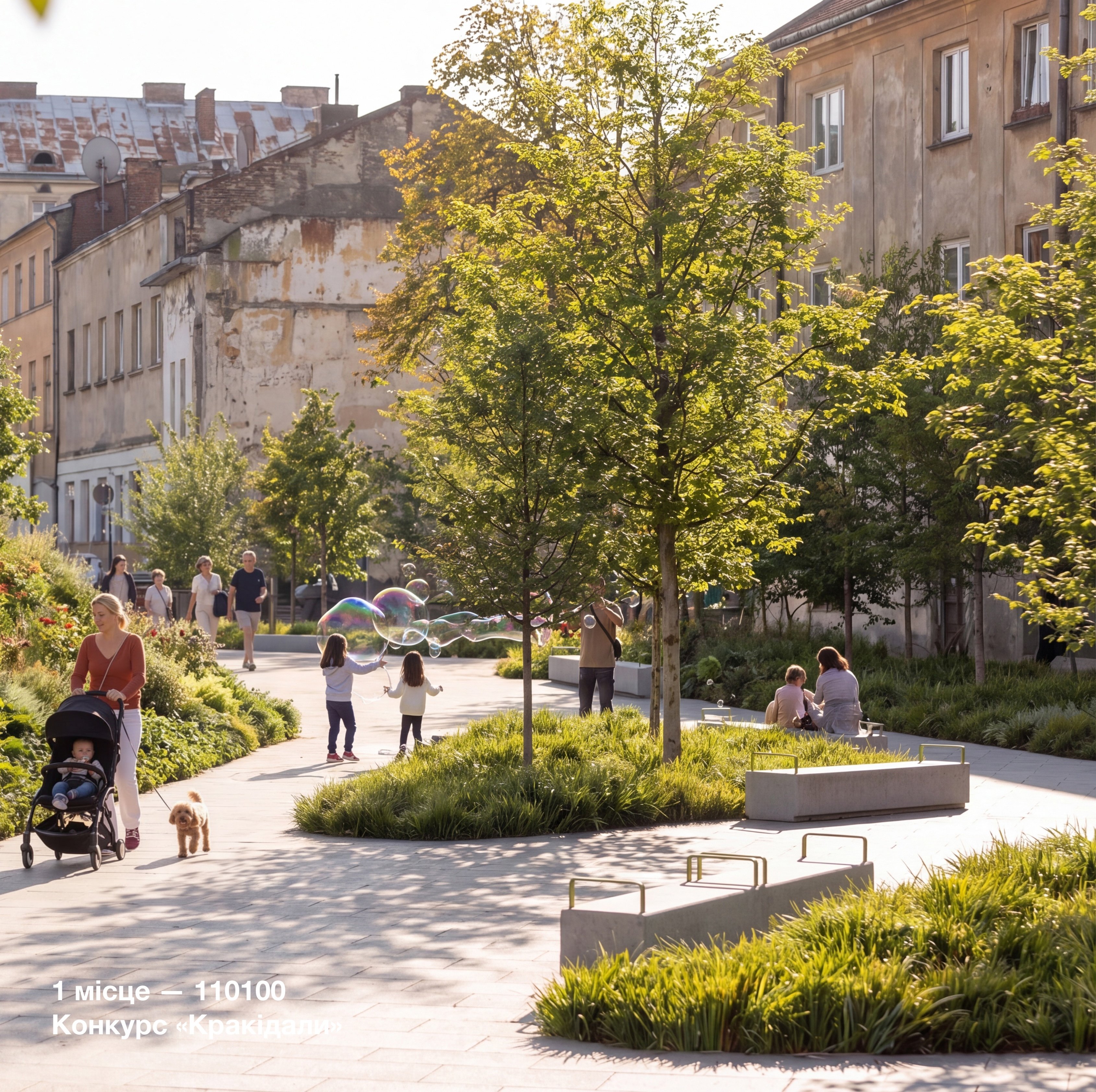 Серед восьми поданих проєктів перемогла команда Urbanideas під керівництвом Ольги Криворучко, яка раніше реалізовувала громадські простори зокрема на пл. Митній та пл. Коліївщини у Львові. У складі колективу – Валентин Шароватов, Анна Кузовкіна, Тетяна Скорбач, Данило Боліжук.