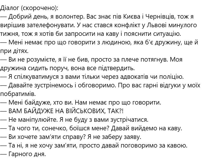 Скорочений телефонний діалог Іванни Антонюк та нападника (скріншот з допису)