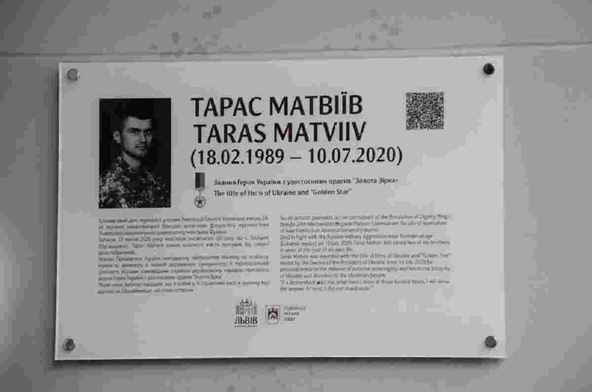 У понеділок, 6 грудня, у Львові вшанували Героя України Тараса Матвіїва, який півтора року тому загинув на Сході. Меморіальну таблицю йому встановили при вході до факультету журналістики Львівського університету, де він навчався. Це вулиця Генерала Чупринки, 49. На відкриття пам'ятного знаку прийшли рідні Героя, його побратими, викладачі та одногрупники.