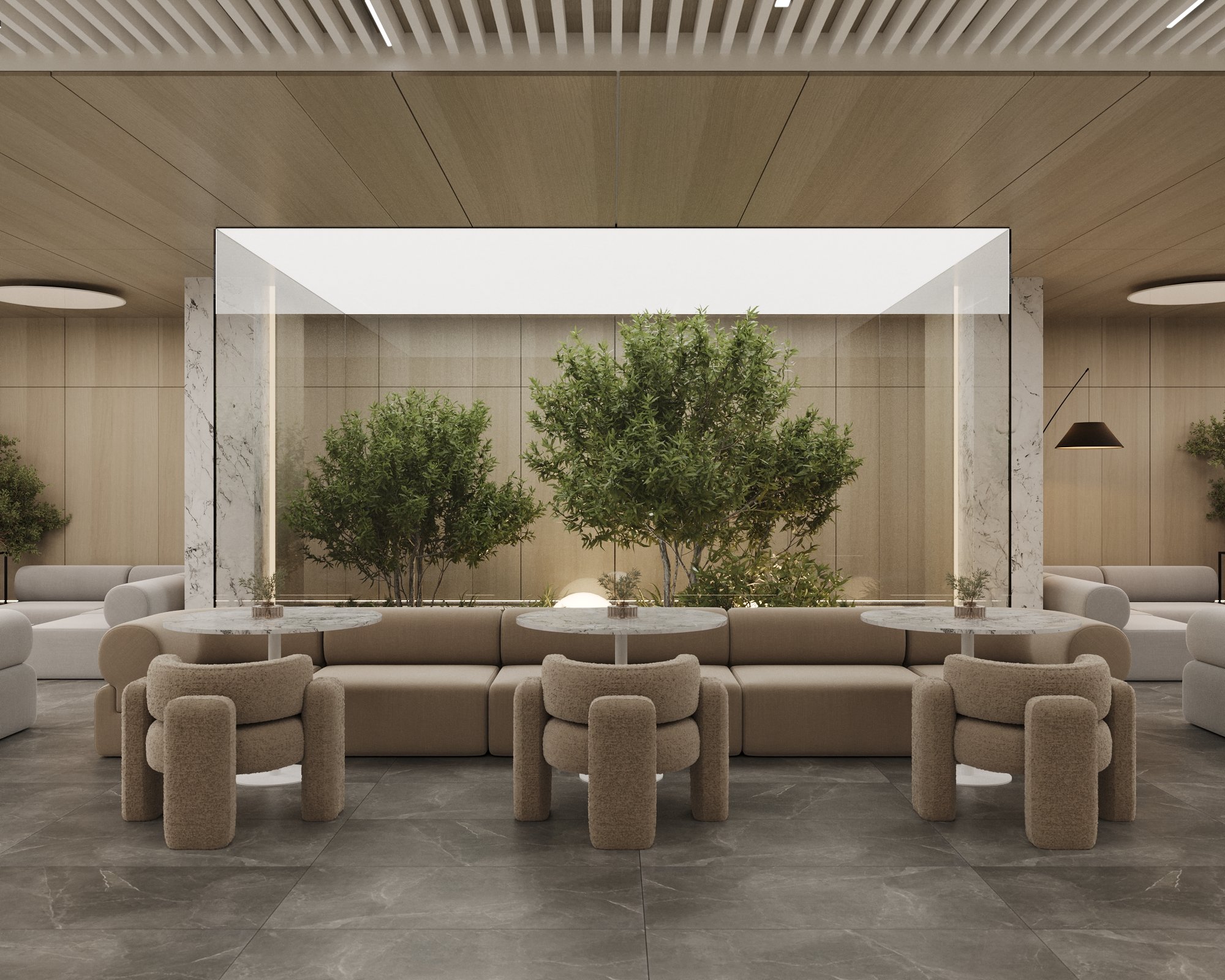 Бізнес-центр створений зі скляним фасадом, що надає йому сучасного та дзеркального вигляду. Інтерʼєр спроектований у ніжних коричневих відтінках, які стимулюють робочий процес, сприяють концентрації та створюють атмосферу комфорту.
