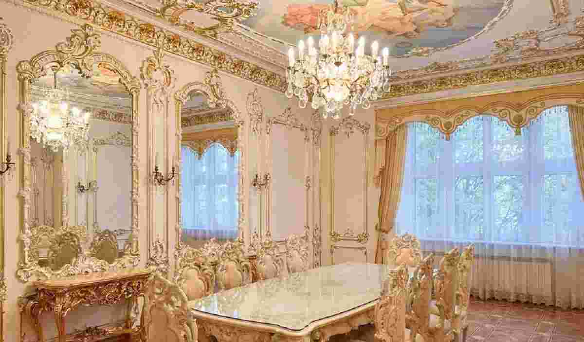 Як видно з фотографій, стелі кімнат розписані малюнками та оздоблені гіпсовою ліпниною з позолотою, стіни обвішані великими дзеркалами, зі стель звисають масивні кришталеві люстри. Також квартира оздоблена масивними меблями в стилі бароко.