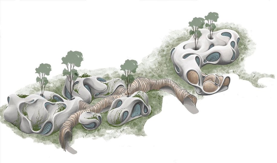 «Творчу лабораторію» Fab Lab місцеві архітектори звели із залізобетону, сталі й пальмового волокна. Центральний модуль здіймається в формі меандру, щоб створити візуальний ефект динамічності. Простір розподілили як незалежні будівлі, щоб адаптуватися до ділянки.