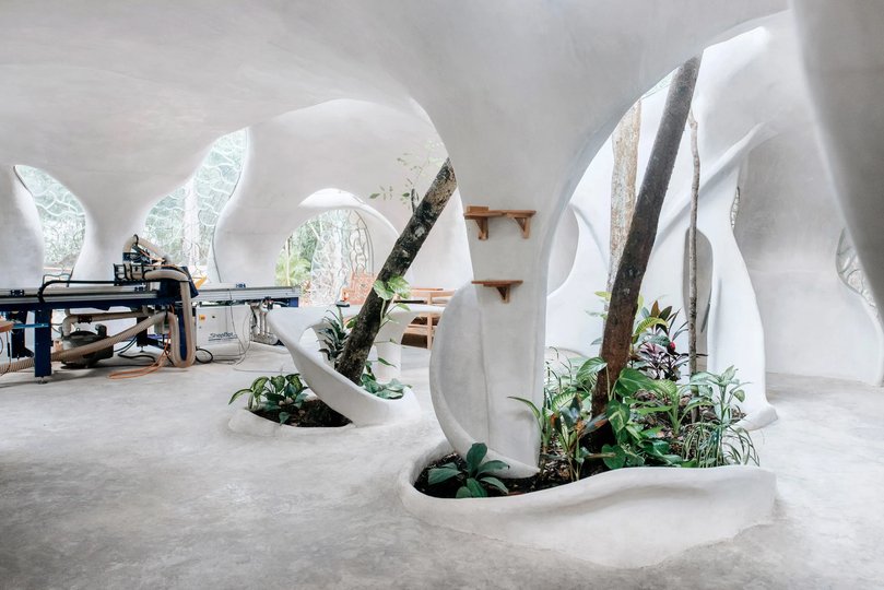 У інтер’єрі використали простори різної висоти. У одній із секцій розмістили хвилястий стіл по довжині стіни. Інший інтер'єр містить відкриті атріуми з деревами, які проходять через центр. Підлогу також частково «заселили» місцевими рослинами із джунглів.