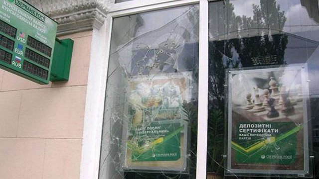 У ніч на суботу, 20 червня, в Миколаєві невідомі закидали відділення «Сбербанку Росії» пляшками із запальною сумішшю.