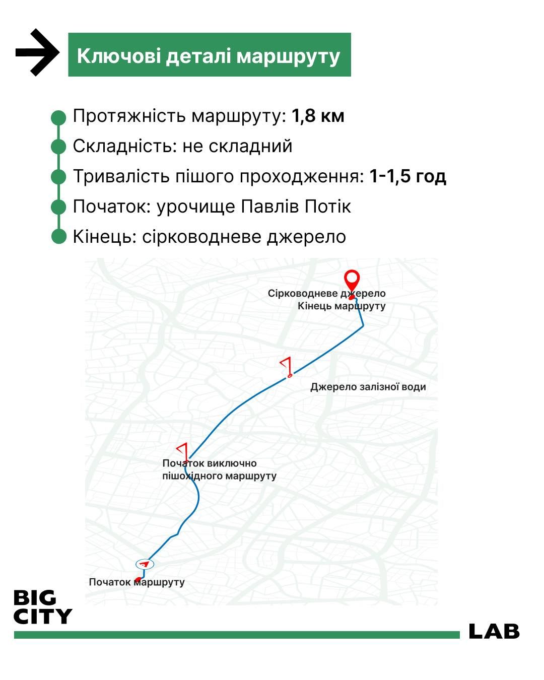 Протяжність маршруту у 1,8 км, який пролягатиме стежкою «До джерел мінеральної води», можна буде пройти за годину-півтори. Прогулянка розпочнеться від урочища Павлів Потік і закінчиться біля сірководневого джерела. По дорозі туристи минатимуть малий водоспад та ще одне джерело залізної води.