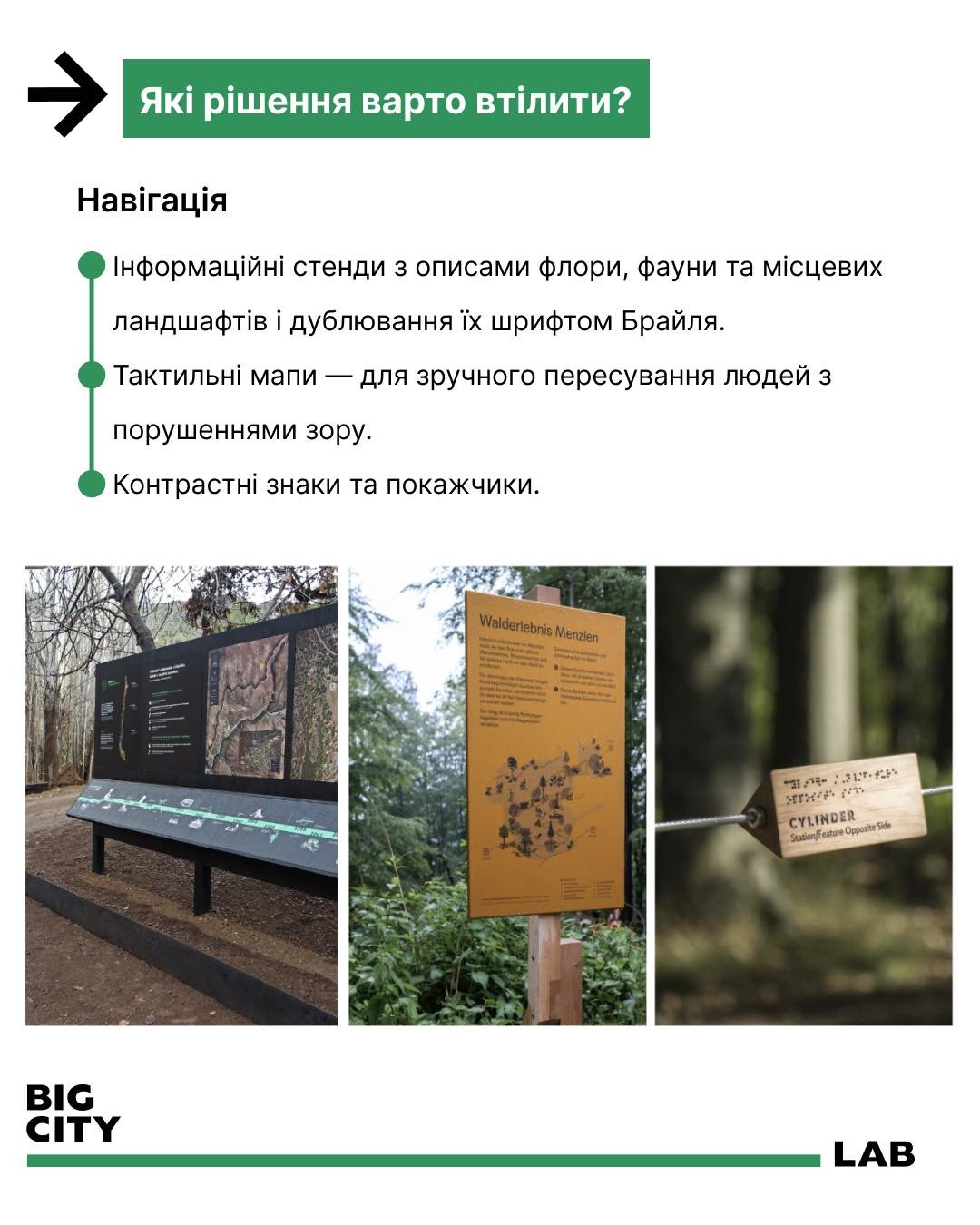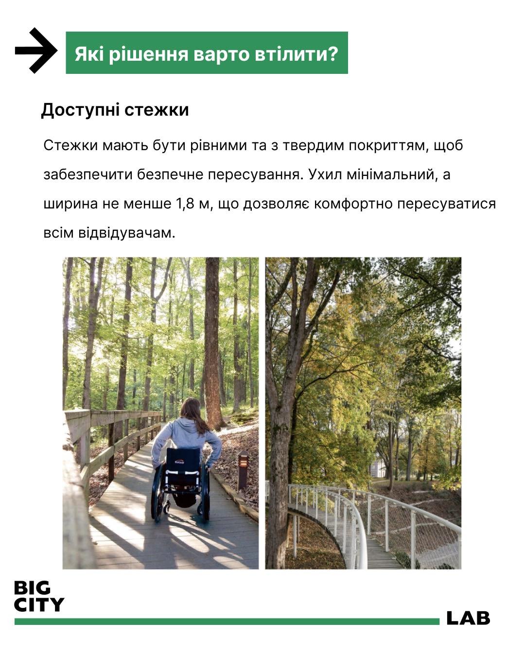 Однак, щоб цими природними локаціями могли насолоджуватись також відвідувачі, які мають труднощі у пересуванні, потрібне спеціальне рівне та безпечне мощення з мінімальним ухилом, тактильні карти і знаки на маршруті, зони для відпочинку.