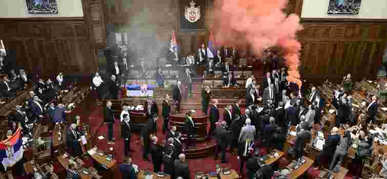 Під час засідання опозиційні депутати розгорнули плакати з написом «Сербія повстане, коли режим впаде», що викликало обурення у керівної партії. У залі почалася штовханина, деякі з депутатів застосували димові шашки та сльозогінний газ.