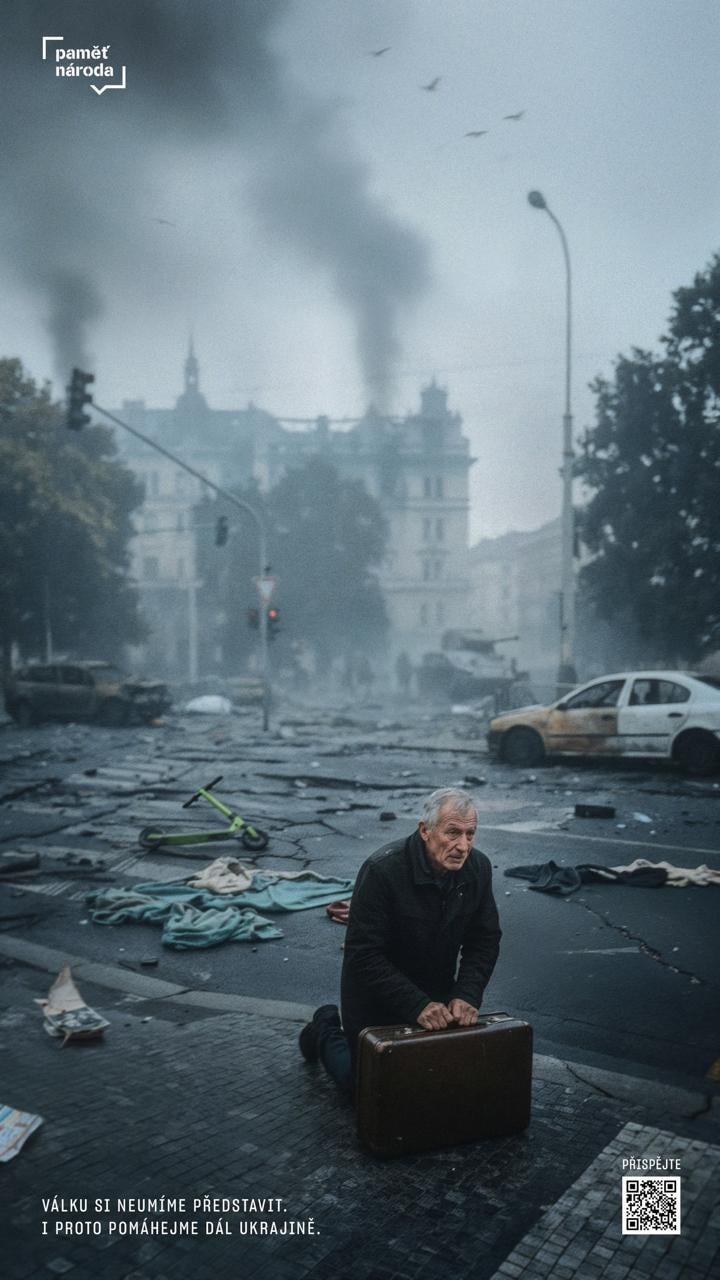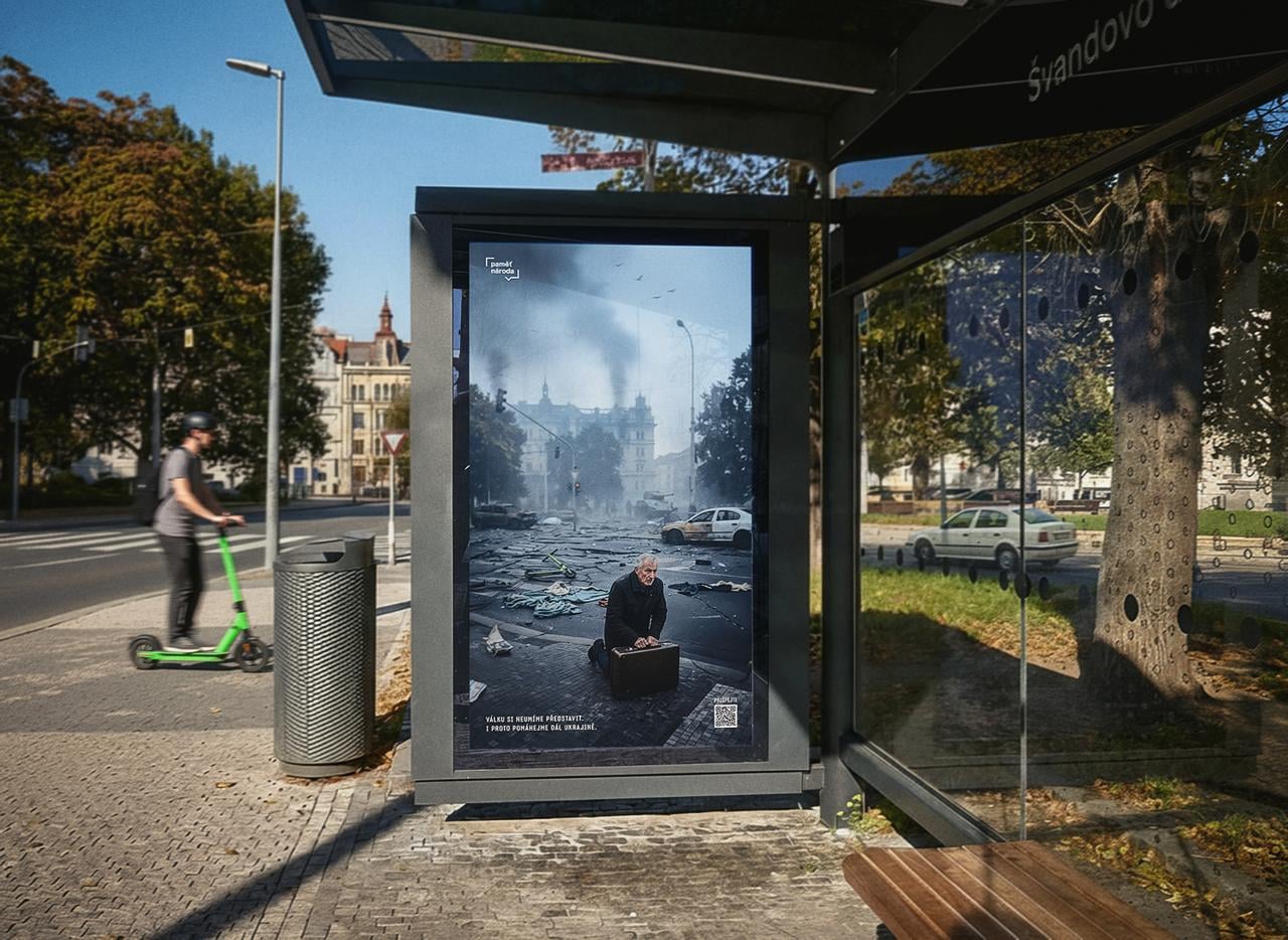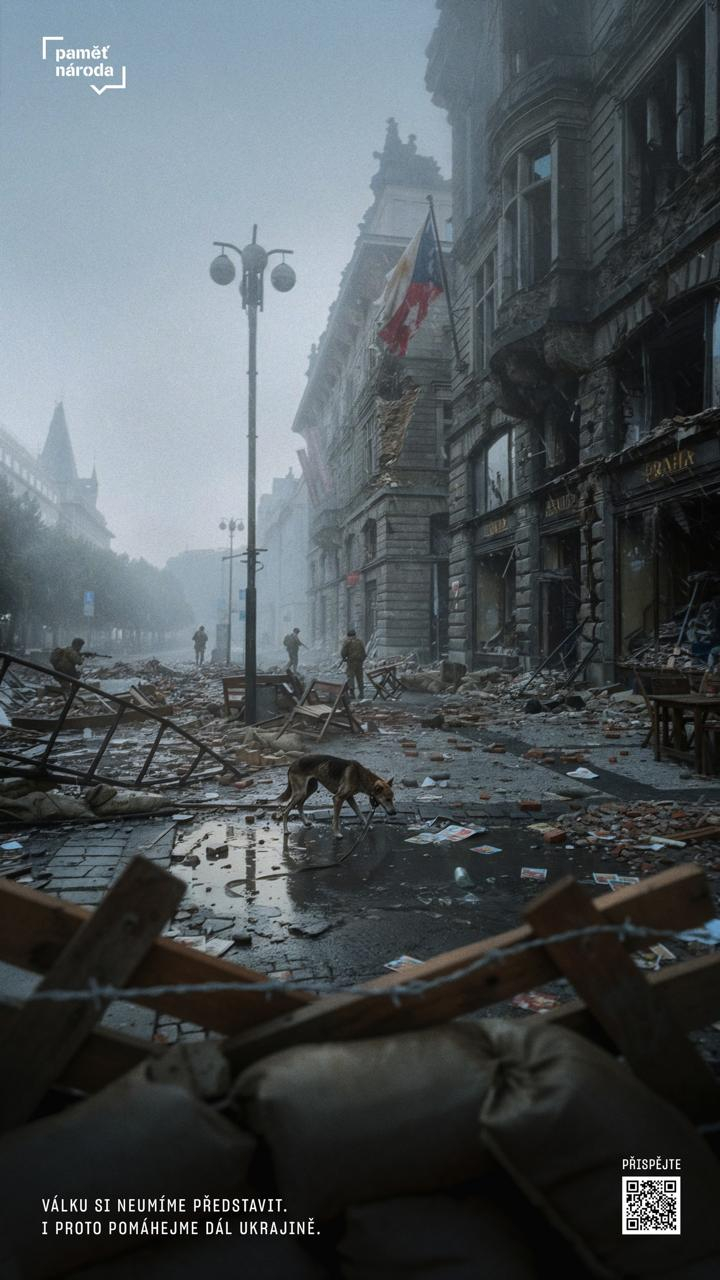 Чеське медіа Paměť národa повідомило, що з 23 жовтня у Празі можні побачити банери, на яких зобразили війну в Чехії. Проєкт реалізували у співпраці з креативною агенцією OAK, яка створила серію зображень про чеські вулиці зруйновані війною. Такі банери вставили з метою нагадати місцевим про те, що війна близько, і Україна потребує допомоги.