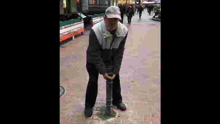 Відео, як чоловік розхитує стовпчик у свіжо залитому цементі, 30 жовтня зняв львів’янин Ігор Фіняк. Чоловік ще й попросив в перехожого допомоги і пояснив, що йому не подобається, що стовпець встановили у цьому місці.