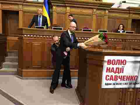 «Народний депутат Олег Барна (фракція «Блок Петра Порошенка»), який збирає підписи під проект резолюції про недовіру уряду, приніс на трибуну прем'єр-міністру букет троянд, припідняв на руки і спробував відтягнути Яценюка від трибуни», – пише Інтерфакс.