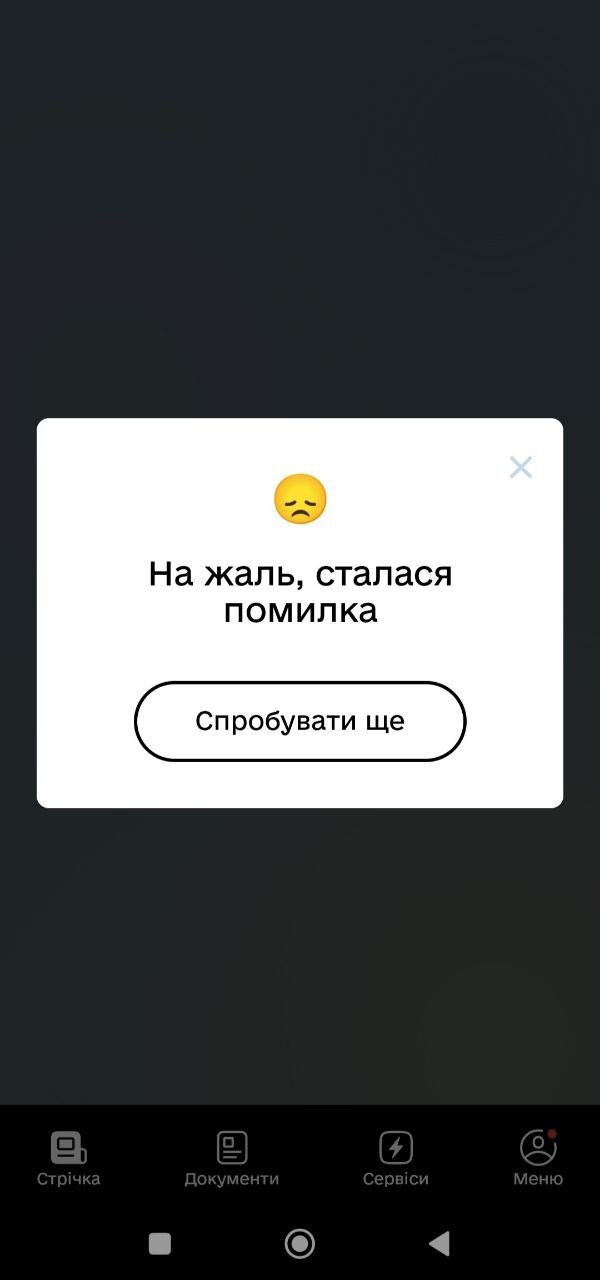 Застосунок не може відкрити усі наявні документи, послуги та інформацію, доступні в «Дії». При вході в додаток з’являється повідомлення «На жаль, сталася помилка».