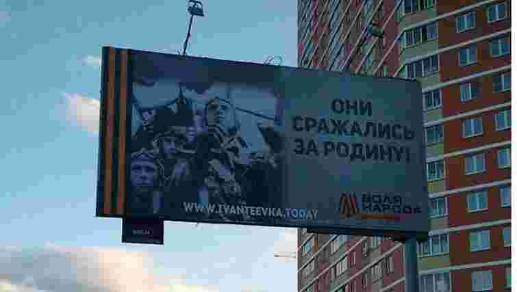 У понеділок 27 квітня відомий російський блогер Рустем Адагамов опублікував у Twitter фотографію рекламного щита в Івантєєвці, на якому фото німецького екіпажу в кабіні бомбардувальника Ju-88 доповнює фраза «Вони билися за батьківщину!» і зображення георгіївської стрічки.